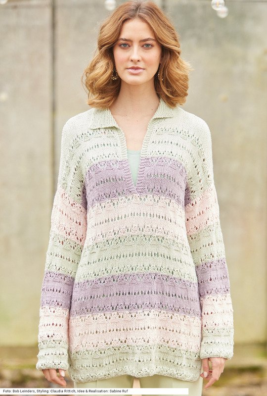 Der Pulli mit Poloausschnitt und Kragen wird aus einem fluffig-weichen Baumwoll-Polyamid-Garn gestrickt. Die aufeinander abgestimmten Blockstreifen in schmeichelnden, gedeckten Tönen von Pastellgrün über Puderrosa bis Holunderviolett unterstreichen den unaufgeregten Verlauf des Fantasiemusters aus löchrigen und glatt rechten Streifen. Nicht nur der ganze Pulli, auch die Ärmel sind extralang. Der Kragen und die Blenden entlang der Seitenschlitze werden kraus rechts gearbeitet. Durch die ganz gerade Schnittführung und die geraden Ärmelkanten ist das Zusammennähen ein Kinderspiel. Die Anleitung ist für die Größen 36/38, 40/42 und 44/46 zum Download bereit.