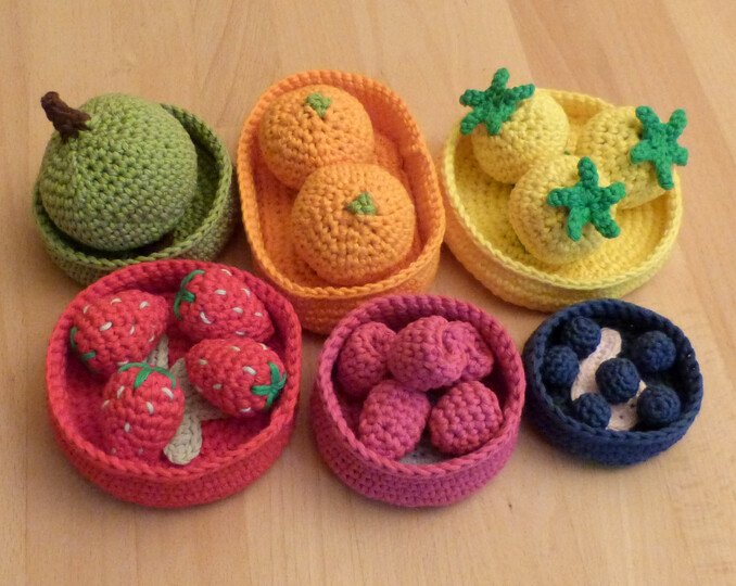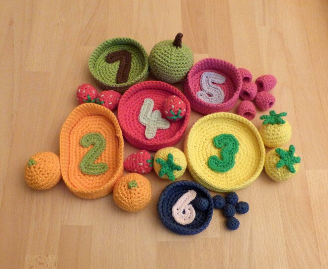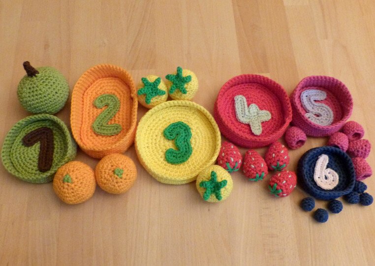 Häkel doch mal ein etwas anderes, vielseitiges Lernspiel, mit dem die ganze Familie Spaß hat und auch die Kleinsten spielerisch Motorik, Koordination, Farben und erste Zahlen lernen können. 6 verschiedene Obst- und Gemüsesorten (Apfel, Clementine, gelbe Tomate, Erdbeere, Himbeere und Heidelbeere), verschieden große Sortierschalen und die Zahlen von 1 bis 6 werden ausführlich beschrieben, mehr als 80 Fotos helfen dabei, den Herstellungsprozess zu veranschaulichen.