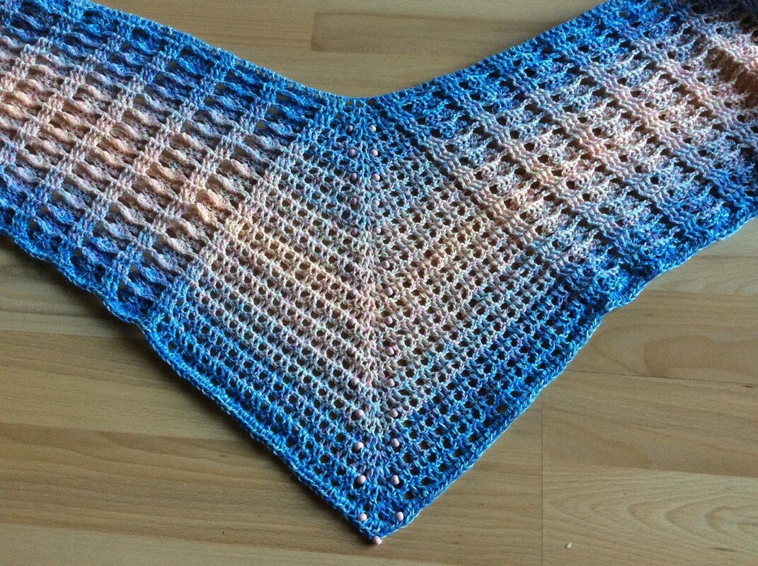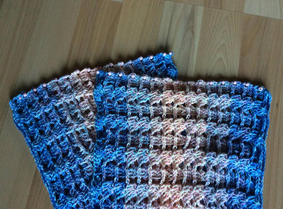 Der Musterschal wurde gehäkelt mit 1 Bobbel im Farbverlauf Glück am Firmament in Spiegelwicklung ( erhältlich bei Glücksgarne) 1000m 4 fädig .