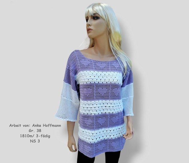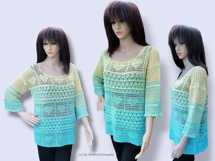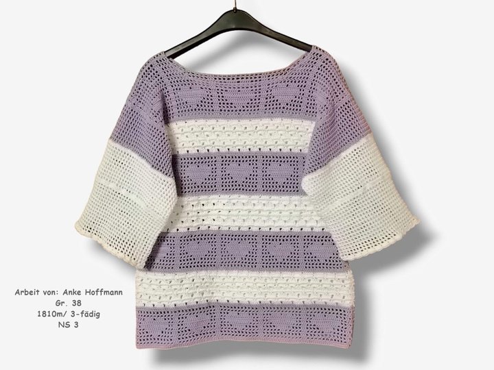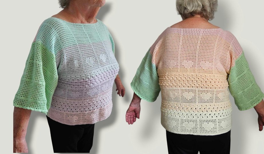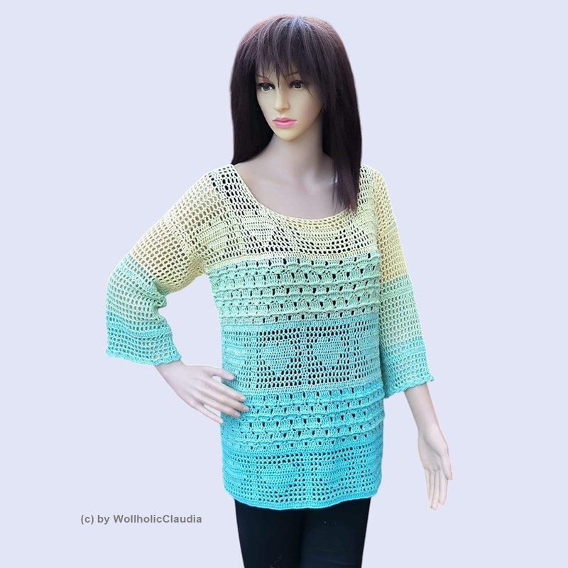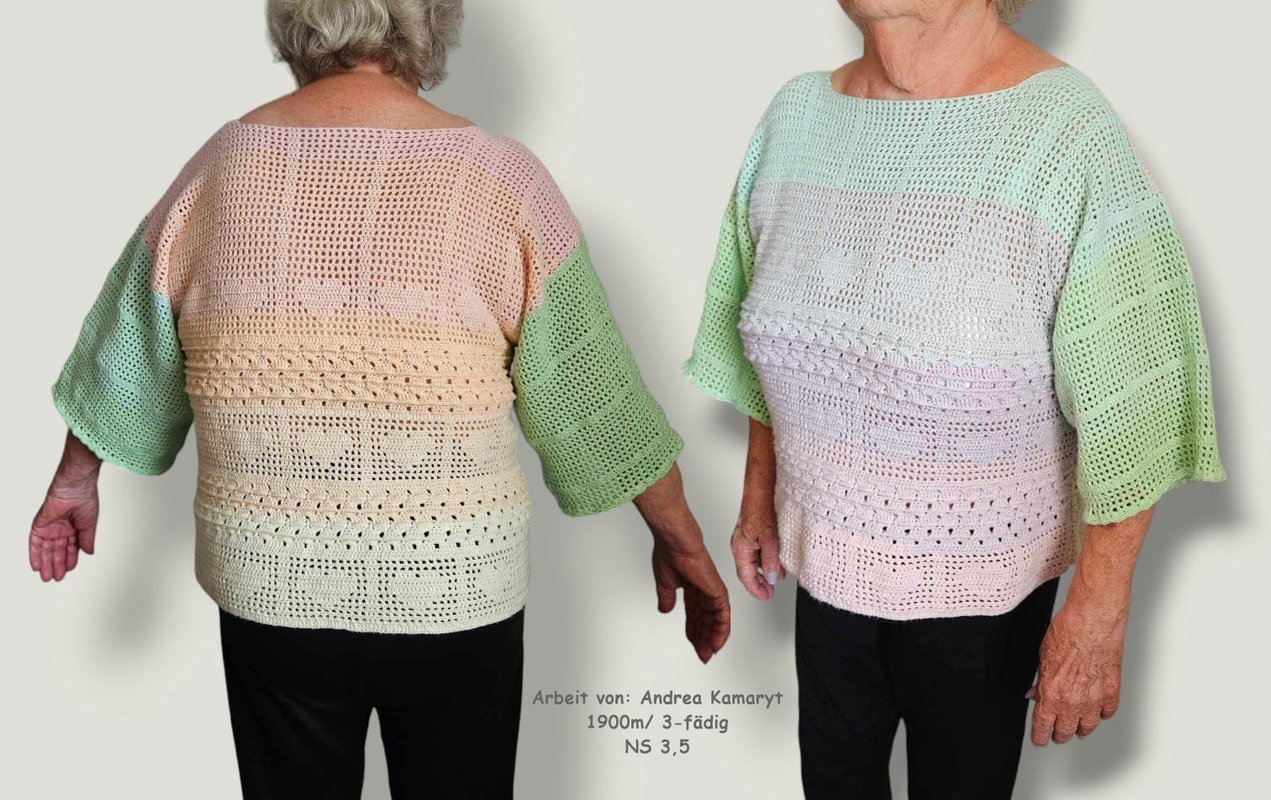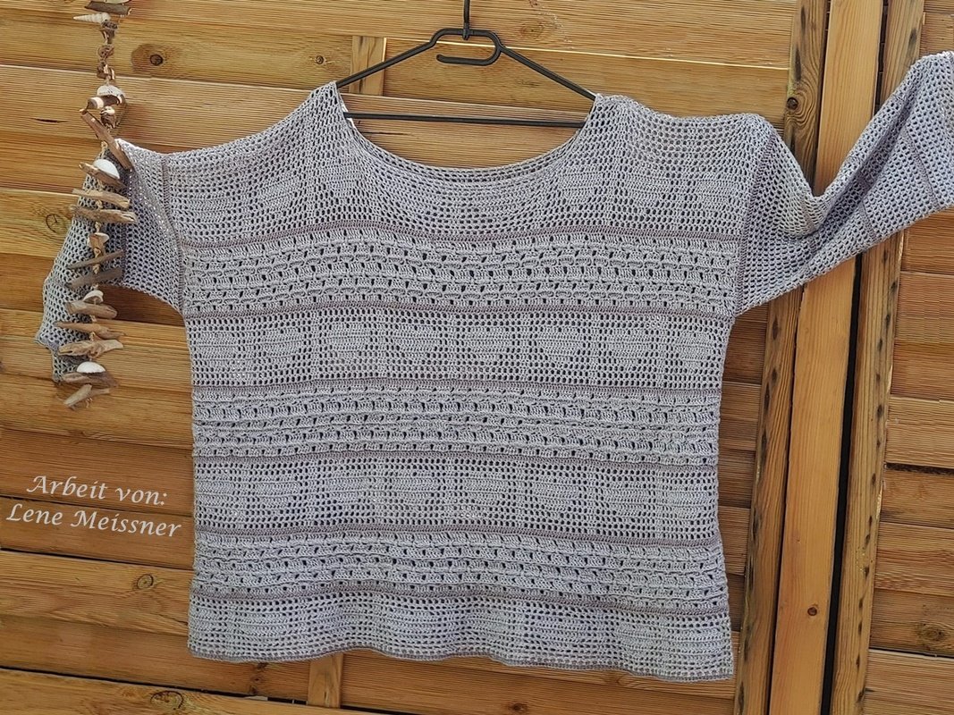 Herzdame ist ein toller luftiger Sommerpulli, der sich aus zwei sich abwechselnden Mustern zusammensetzt. Er ist ganz einfach zu häkeln und absolut fernsehtauglich.