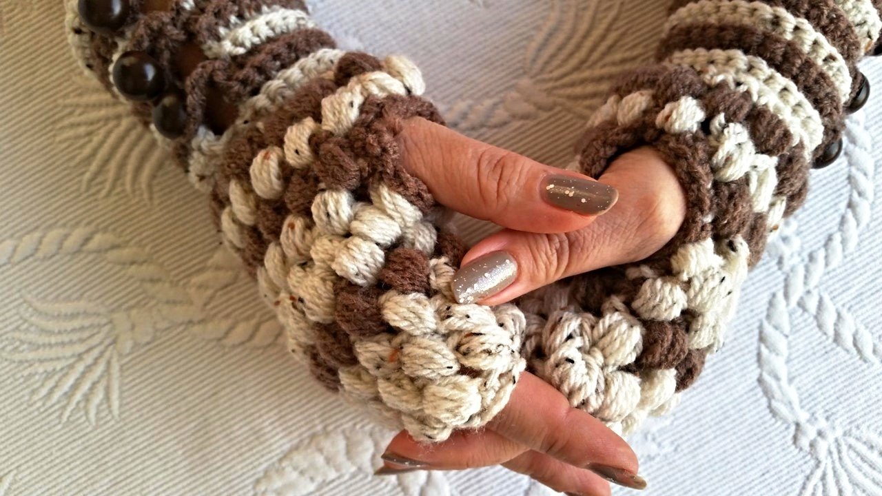 Schöne Handstulpen für die Herbst und Winterzeit ,angenehm zu tragen und in jeder Farbe ein schönes Accessoires. Die Stuloen bestehen aus 2 unterschiedlichen Mustern ,die sich gut ergänzen.Die Büschelmaschen werden in der Anleitung separat erklärt.