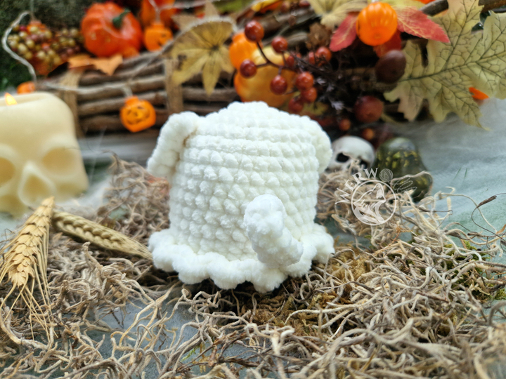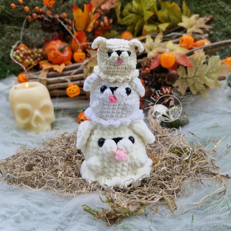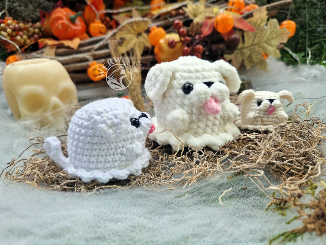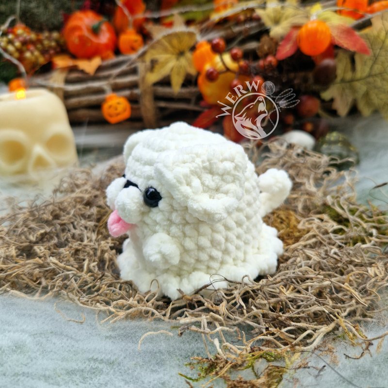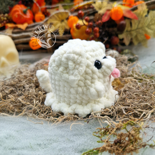 Dies ist eine Anleitung zur Herstellung eines Geisterhund Amigurumis ohne annähen der Ohren und Pfoten. Es ist eine schriftliche Anleitung, die auf deutsch und englisch verfügbar ist.