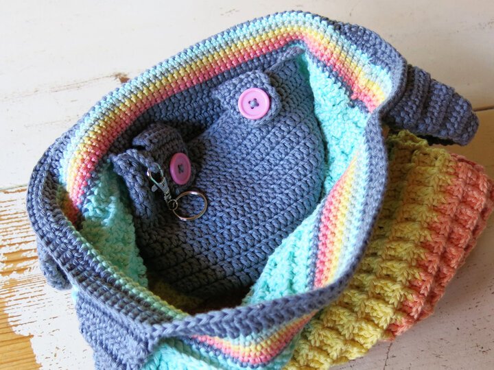 Mit 4.0 mm Nadel und DK Garn (z.B. Catania Grande, Puppets Lyric 8/8) wird die große Tasche 40 x 33 cm (Höhe x Breite) groß und die kleine Tasche 30 x 33 cm.
