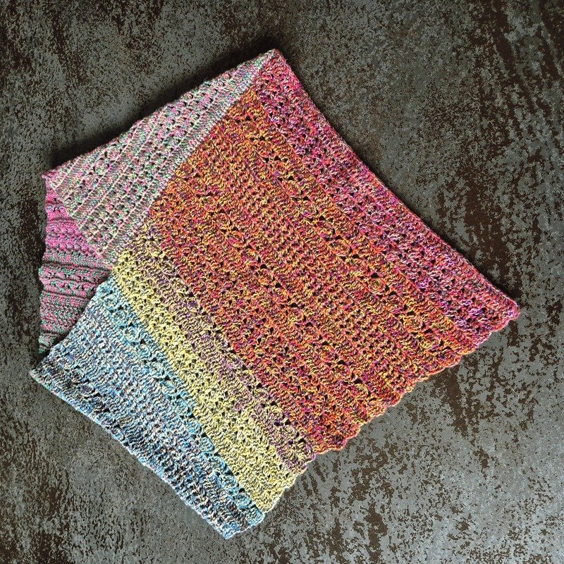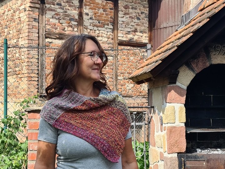 Der Isipisi wird aus der Ecke heraus gehäkelt und breitet sich schräg nach oben aus – das macht ihn nicht nur spannend zu arbeiten, sondern auch zu einem echten Hingucker. Besonders bei Farbverlaufsbobbeln zeigt dieser Aufbau eindrucksvoll, was dein Garn kann.