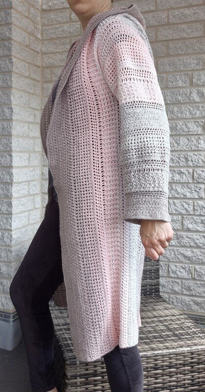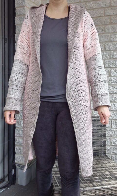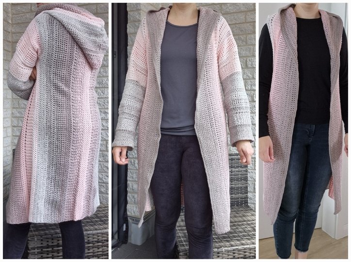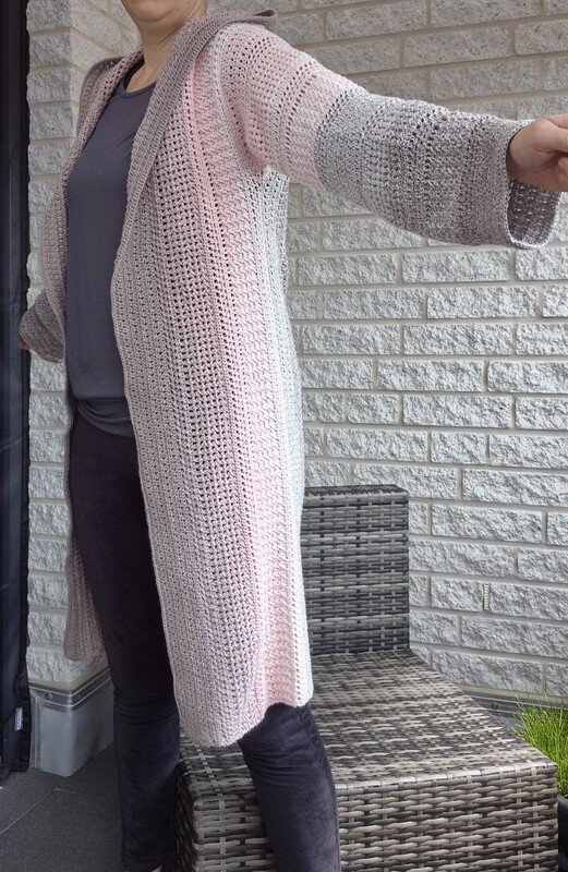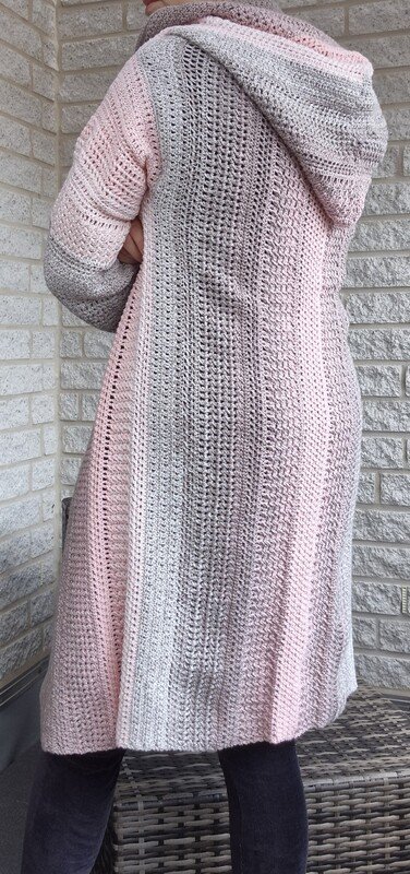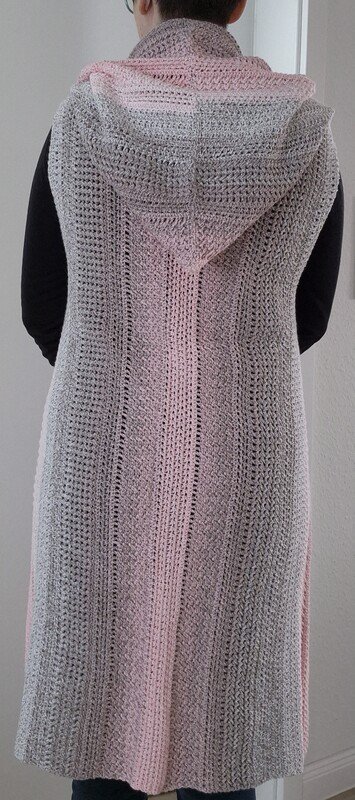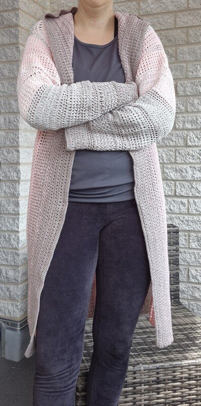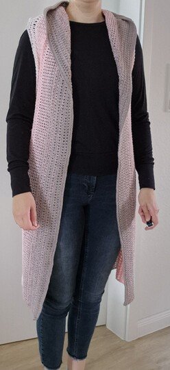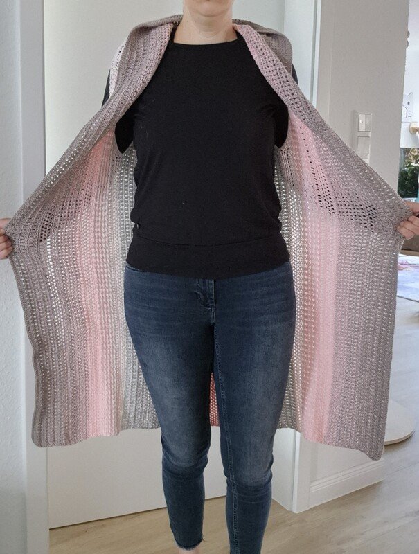 Der Mantel/die Weste im Titelbild entspricht der Größe 40 - 42 und wurde mit NS 3,5 gehäkelt.