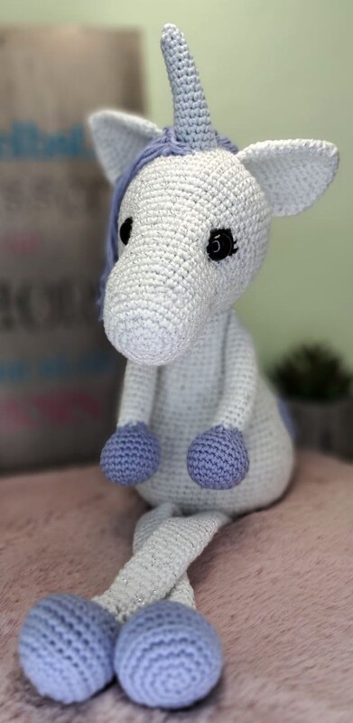 Das Glitzer-Einhorn Elinor wird mit Nadelstärke 2,5 und passendem Garn etwa 25 cm hoch