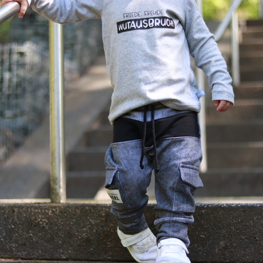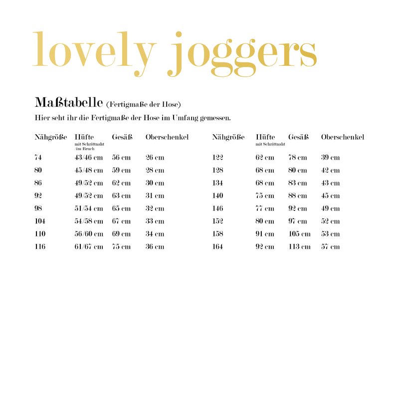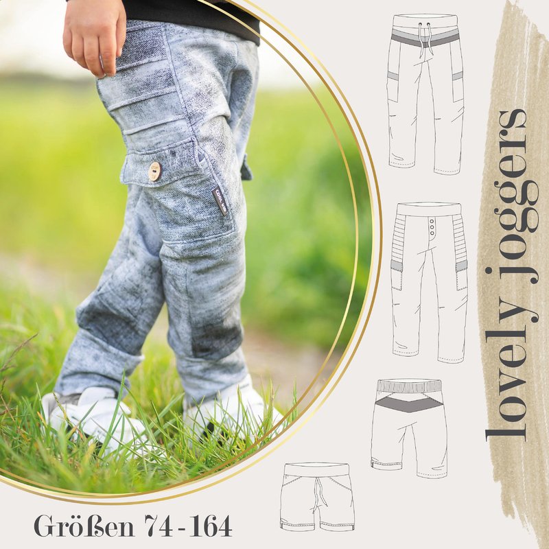 lovely joggers ist eine locker geschnittene Hose, die Kinder (Größe 74-164) über das ganze Jahr tragen können. Sie kann in 3 verschiedenen Längen, 2 Weiten und aus unterschiedlichen Stoffarten genäht werden.