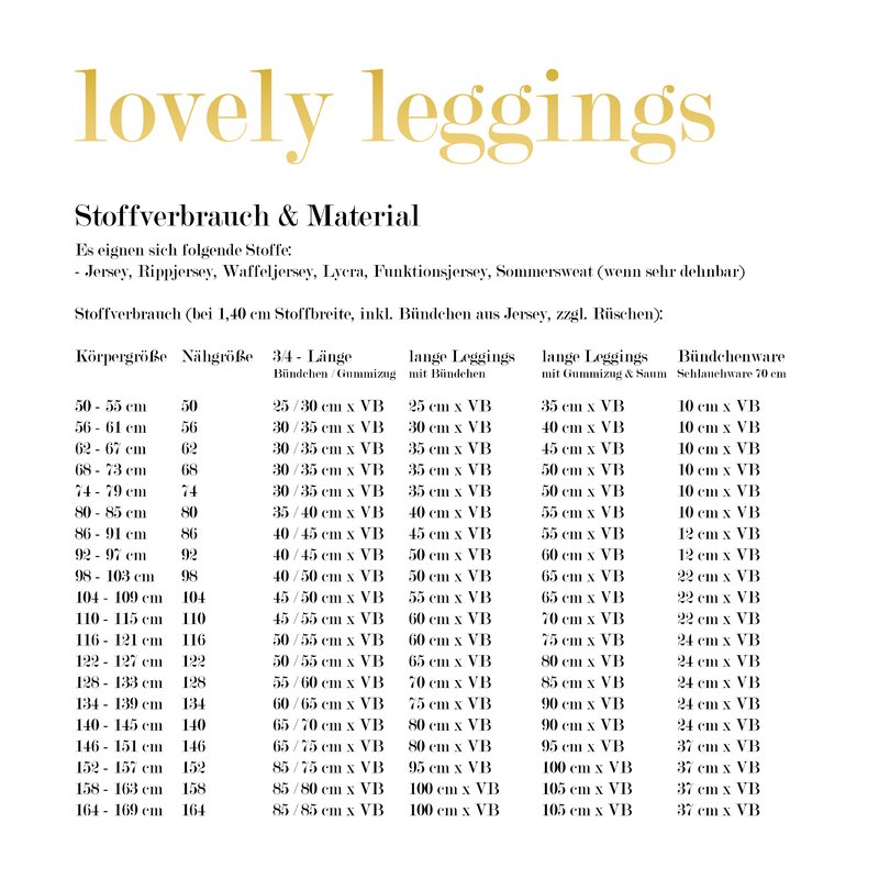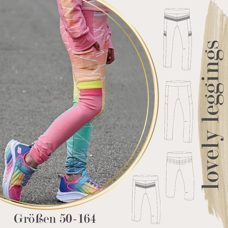 lovely leggings ist eine bequeme, anliegende Leggings, die Mädchen & Jungen (Größe 50-164) über das ganze Jahr tragen können. Sie kann als 3/4 Leggings und lange Leggings mit Jersey, Lycra und auch dehnbarem Sommersweat genäht werden.