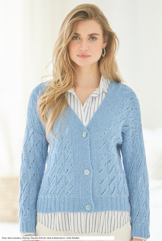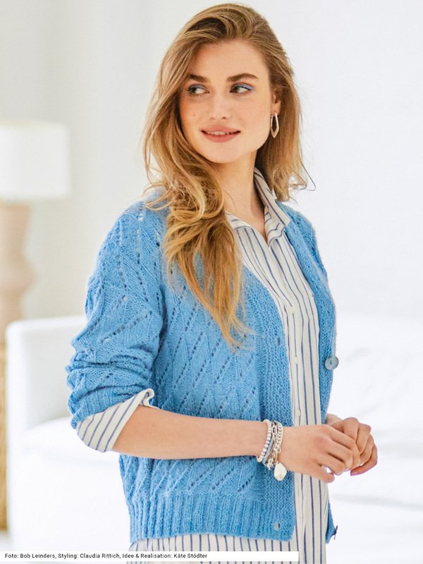 Ganz klassisch geschnitten ist diese Jacke mit überschnittenen Schultern, Rippenbund und kraus rechts gestrickter Knopfblende immer und überall einsatzbereit. Das weiche Garn aus einer Mischung von Baumwolle, Alpaka und Polyamid sorgt für einen Kuschelfaktor und die Farbe Himmelblau lässt sich frisch zu Weiß oder zurückhaltend mit anderen Blautönen kombinieren. Die Strickschrift des Ajourmusters geht schnell ins Gedächtnis, sodass man nicht lange braucht, um es "freihand" zu stricken. Entlang der Vorderteilränder wird glatt links gearbeitet. Eine Anleitung steht für die Größen 36/38 und 44 sowie 50/52 bereit.