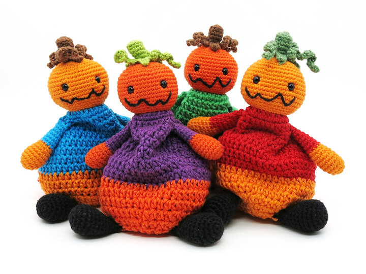 Mit 2.0 mm & 3.0 mm Nadel und Sport Garn (z.B. Catania Originals) wird der Kürbis 15 x 8 cm groß (ohne Arme, Beine & Stiel).