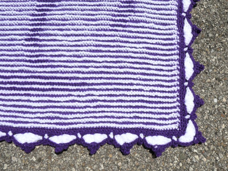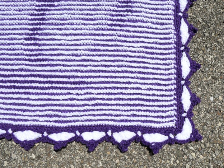 Ich habe die Decke mit Schachenmayr Bravo Originals Wolle in weiß und violett mit Nadelstärke 3,5 gestrickt. Um die Decke zusammenzuhäkeln, habe ich Häkelnadeln der Größe 3,5 sowie 3,0 verwendet.