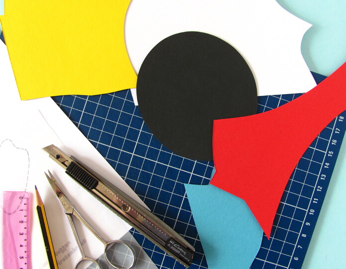 Laternenschachtel/Käseschachtel Ø 15 cm; Mobilefolie/Strohseide/Sprühkleber oder Alternativ farbiges Transparentpapier zum Umkleben der Laterne; Fotokarton; Papierdraht in Gelb; Bunt- und Filzstifte; Gelstift bzw. Acrylstift in Weiß; Transparentpapier Weiß; Bleistifte; Tesafilm; Cuttermesser mit Unterlage oder Scheren; Heißklebepistole/Klebstoff; Drahthaltebügel oder Draht; Seitenschneider; Zange; Lineal; Optional: Kreis-Schablone; Laternen-Teelichthalter.