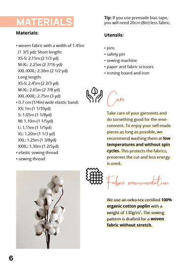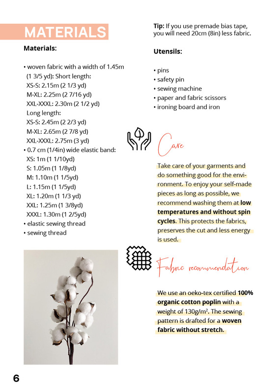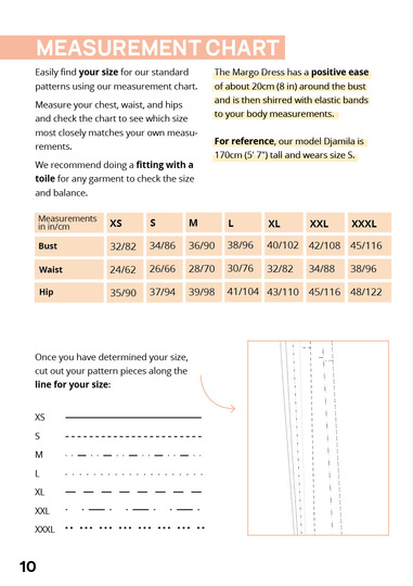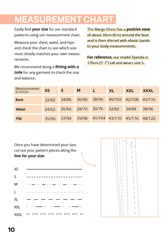 Das Sommerkleid Schnittmuster The Margo Dress hat eine Mehrweite von ca. 20cm auf Höhe der Brust, die zusammengerafft wird. Als Referenz: Unser Model Djamila ist 1,70m groß und trägt Größe S.