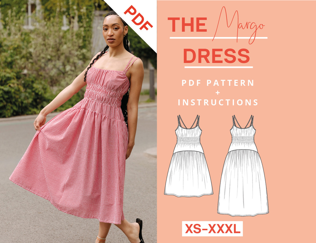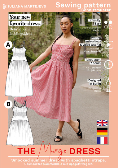 Du möchtest dir ein wunderschönes Sommerkleid nähen? Mit dem Trägerkleid Schnittmuster The Margo Dress kannst du ganz einfach dein nächstes Kleid selber nähen und zauberst dir damit einen super vielseitigen und eleganten Klassiker für deine Sommergarderobe! Die gesmokte Taille schmeichelt elegant der Figur, während der weit geschnittene Rock, der an der Hüfte angesetzt ist, für eine spielerische Leichtigkeit sorgt. Ein luftiger Stoff und das stilvolle Design machen das Sommerkleid Schnittmuster zu einem Muss unter Hobbynähern. Ideal für Strandspaziergänge, Gartenpartys oder einfach entspannte Stunden in der Sonne. Das Margo Dress ist hervorragend für alle, die ein schnelles Sommerkleid nähen möchten, egal ob Nähanfänger oder Profi. Mithilfe der detaillierten Videoanleitung sowie der schriftlichen, bebilderten Nähanleitung zum Trägerkleid Schnittmuster The Margo Dress kannst du ganz einfach dein neues Kleid selber nähen und lernst dabei noch Schrägband selberzumachen, Raffungen zu nähen und Stoff mit Gummiband zu smocken.