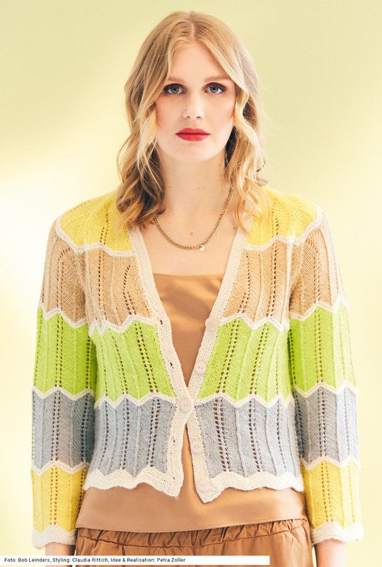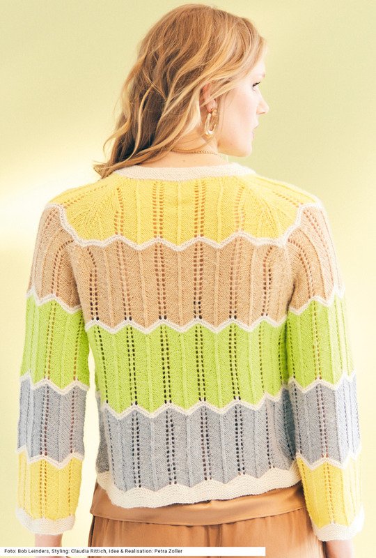 Diese Jacke mit Raglanschrägen und V-Ausschnitt beweist, dass prägnantes Colourblocking und ein dezentes Ajourmuster sich nicht ausschließen müssen. Für einen harmonischen Ausgleich sorgen schmale, kraus rechts gestrickte Rippen in Wollweiß als Bindeglied zwischen den Farbblöcken. Die breiten Streifen sind in Grau, Neongrün, Beige und Gelb gestrickt. Das Ajourmuster ist ganz einfach, der Höhenrapport besteht lediglich aus Hin- und Rückreihe. Das Garn aus Merinowolle, Polyamid und Seide ist pflegeleicht und kann im Wollwaschgarn gewaschen werden. Eine Anleitung ist für die Größen 36/38, 40/42 und 46/48 vorhanden.