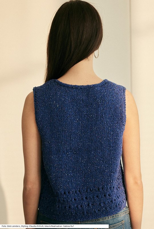 Das modisch kurz geschnittene Top im cropped Style ist derzeit absolut angesagt. Ein paar Lochmusterreihen am unteren Ende, ansonsten ganz glatt rechts gestrickt, stellen auch für Neulinge mit wenig Erfahrung keine unüberwindbare Hürde dar. Das Modell ist vielseitig, denn es empfiehlt sich nicht nur für den Sommer zum Solotragen, sondern auch für den Winter als Pullunder. Es ist aus einer Mischung von Schurwolle, Polyamid und Seide in einem starken Blau gearbeitet. Es gibt die Anleitung zum Downloaden für die Größen 36/38, 40/42 und 44/46.