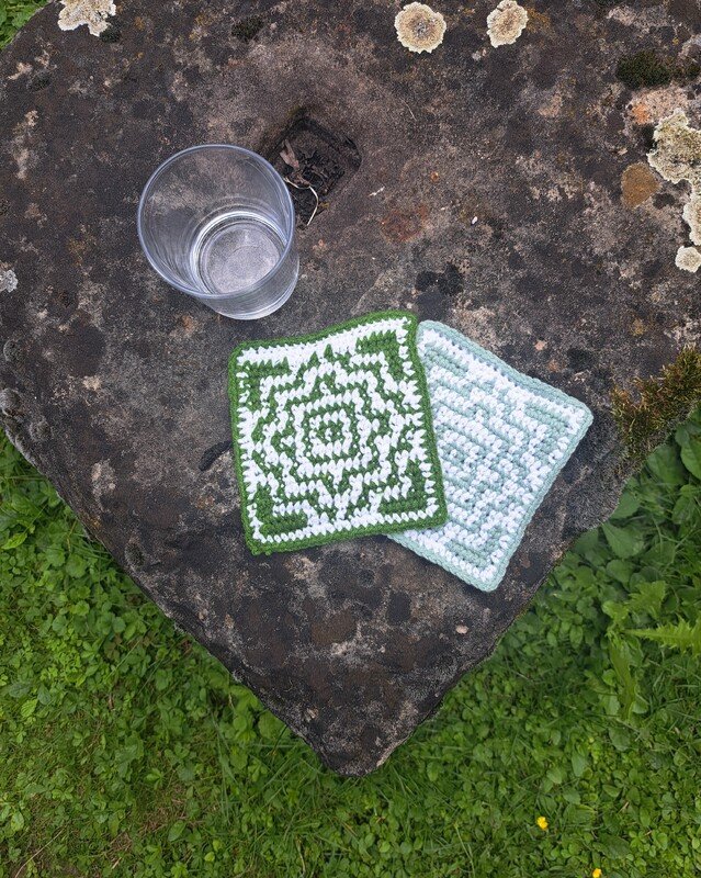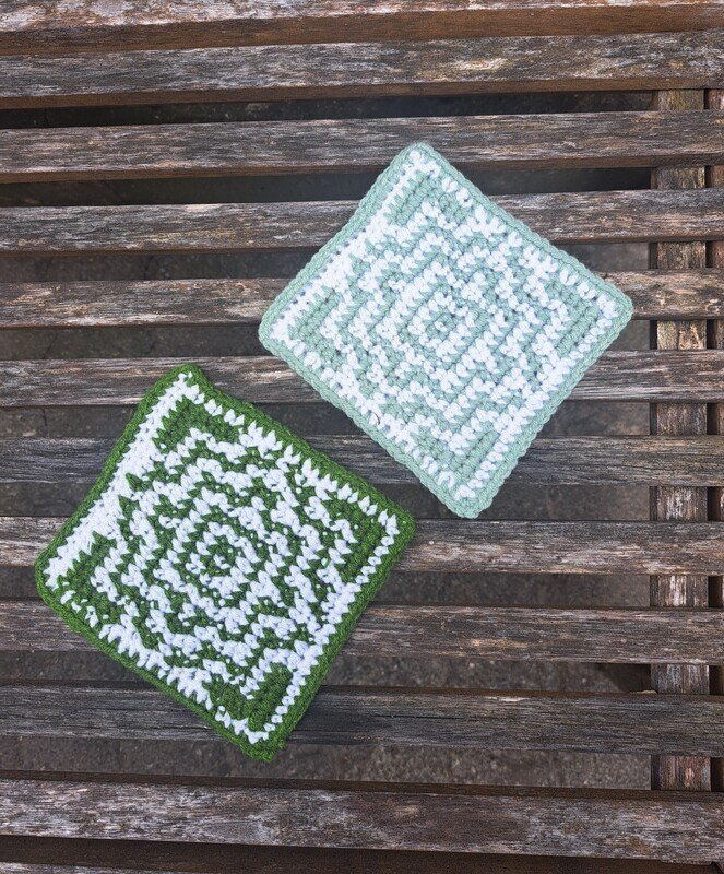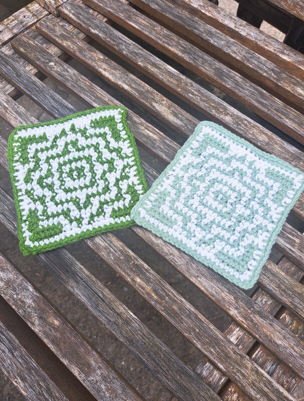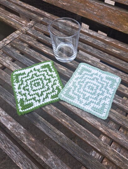 Pro Untersetzer 2 Farben DK garn entweder Baumwolle oder Acryl. ca. 7 gr. pro Farbe.