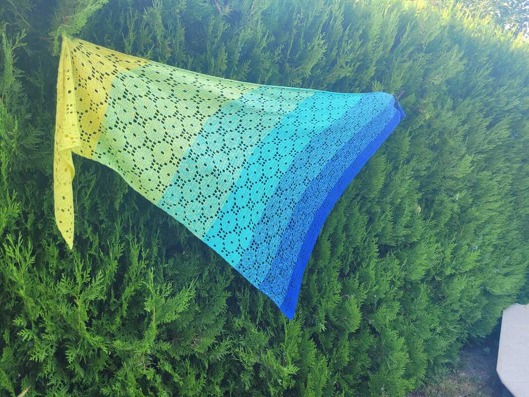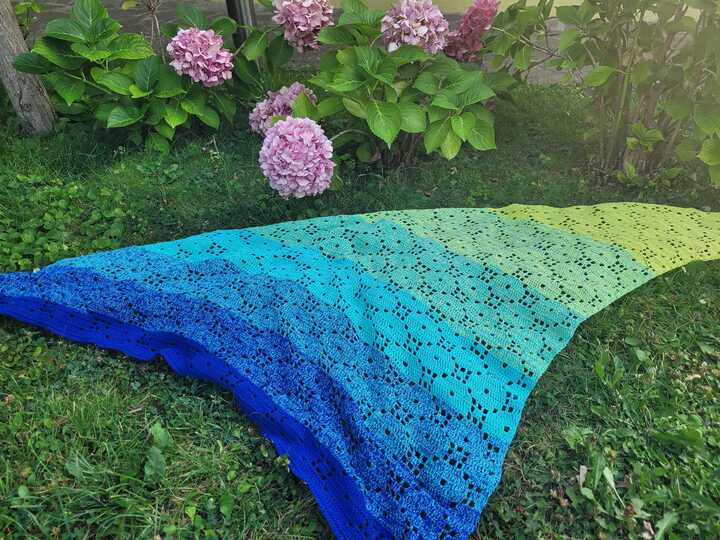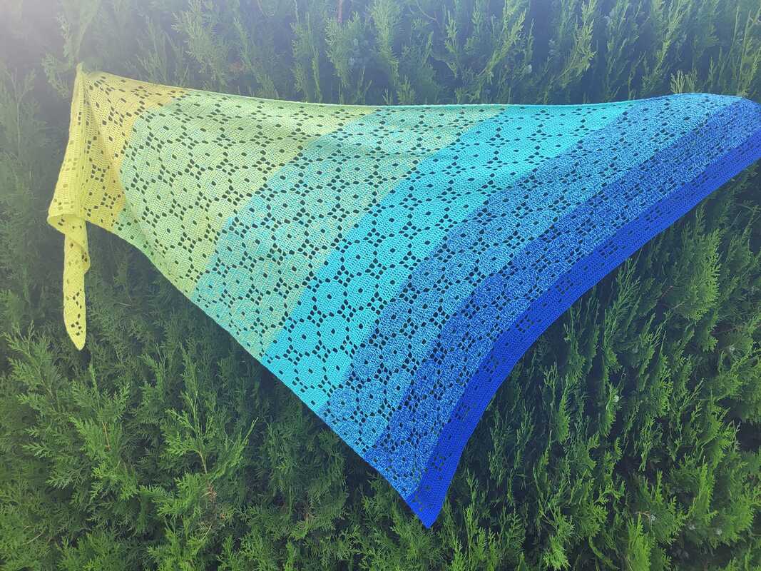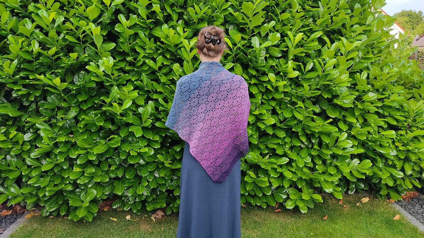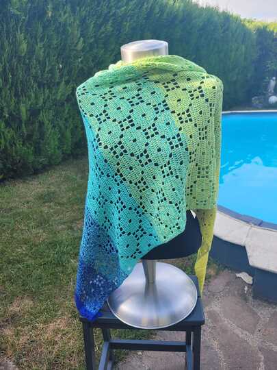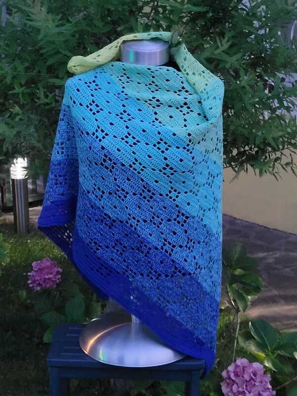 Das Tuch wird von einer Spitze aus gehäkelt und ist in der Größe beliebig verlängerbar.