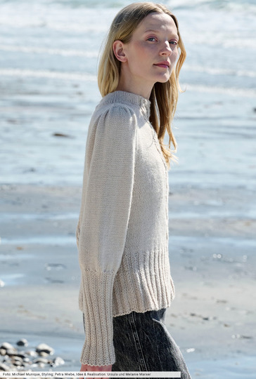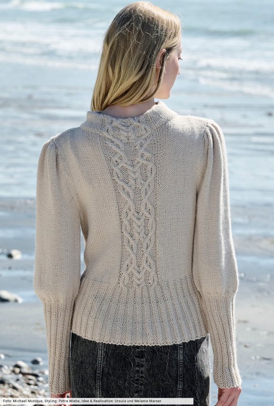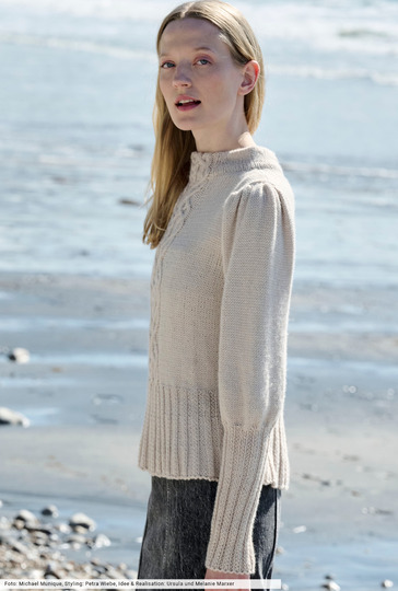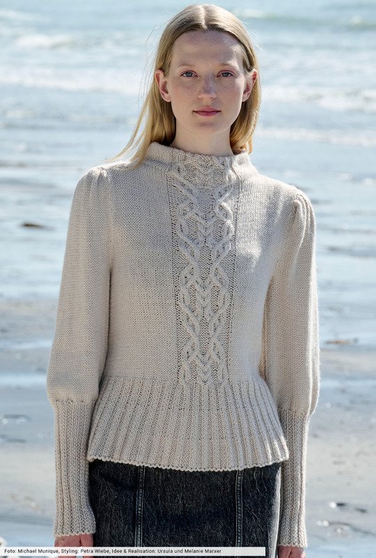 Ausschlaggebend für die klassische Masche sind nicht nur unauffällige Farben, sondern auch unaufdringliche Silhouetten. Bei diesem aparten Pulli kommen hohe Rippenbündchen und modische Keulenärmel ins Spiel. Für den verschlungenen Zopf in der Mitte haben wir in der Anleitung eine Strickschrift angelegt, nach der du dich orientieren kannst. Beidseitig des Zopfes strickst du glatt rechts, beide Muster gehen zum Schluss perfekt in den doppelten Stehkragen über.