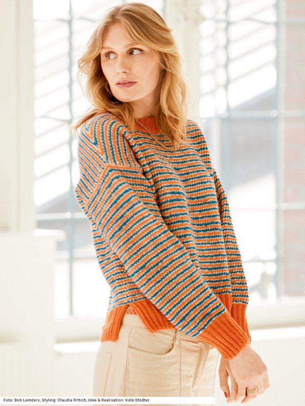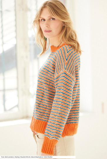 Drei leuchtende Farben kennzeichnen diesen lässigen Pulli mit überschnittenen Schultern. Die orangefarbenen Bündchen und die Blende am runden Halsausschnitt werden im sogenannten falschen Patent gestrickt, das nur aus rechten und linken Maschen besteht und somit recht einfach zu stricken ist. Für das Hebemaschenmuster werden immer zwei Reihen glatt rechts in Sandmeliert und dazwischen mal in Petrol, mal in Orange, Hebemaschen und rechte Maschen gestrickt. Die gerade eingesetzten Ärmel des Pullis aus Schurwolle-Polyamid-Mischgarn ergeben überfallende Schultern. Eine Anleitung kann für die Größen 38/40, 42/44 und 46/48 downgeloadet werden.