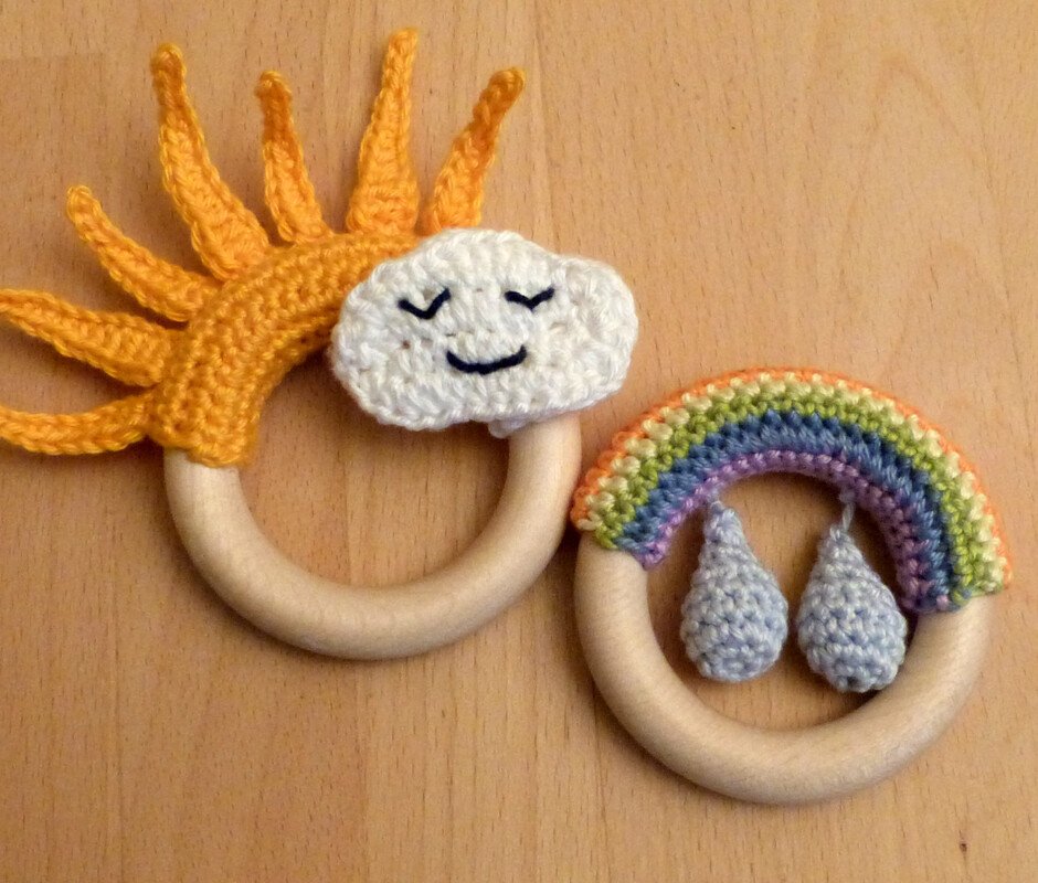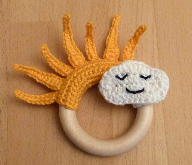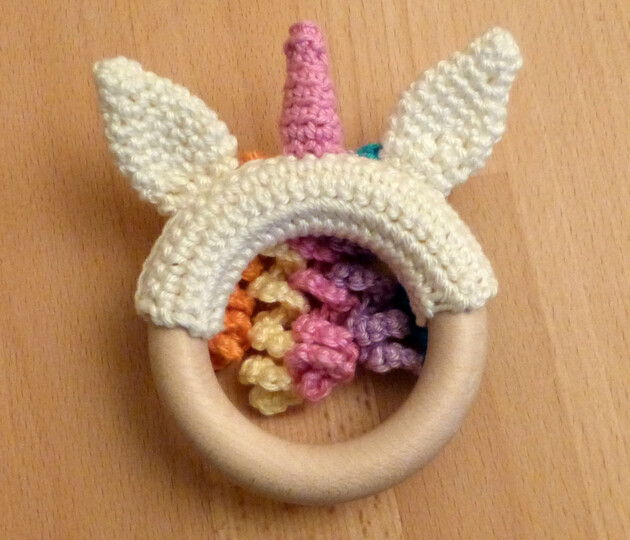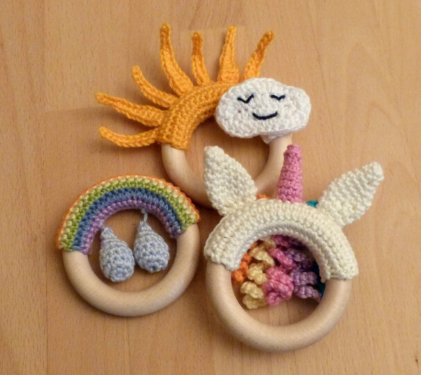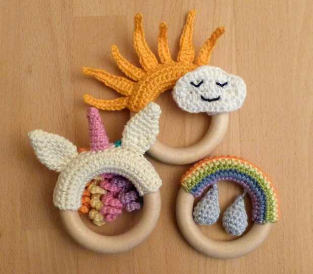 Ein Greifling ist ein tolles erstes Spielzeug für Babys ab ca. 3 Monaten und bietet viele Möglichkeiten, motorische und sensorische Fähigkeiten zu trainieren: Man kann ihn fühlen, greifen und sehen. Der Holzring kann in den Mund gesteckt werden und auch hilfreich beim Zahnen sein. Das gehäkelte Spielzeug ist leicht und es geht nicht kaputt, wenn es mal runterfällt! Es werden die 3 Modelle Einhorn mit Regenbogen-Mähne, Regenbogen mit Regentropfen und Sonne mit Schönwetter-Wolke beschrieben.