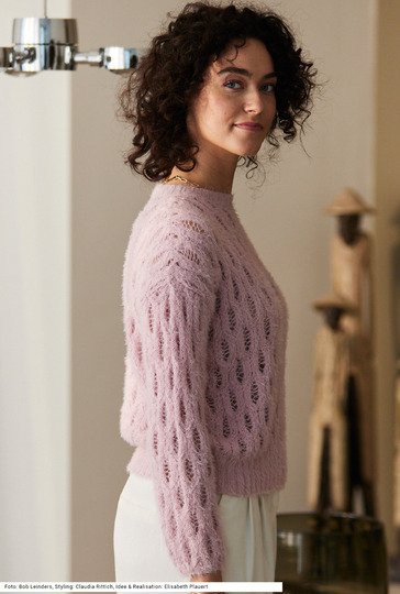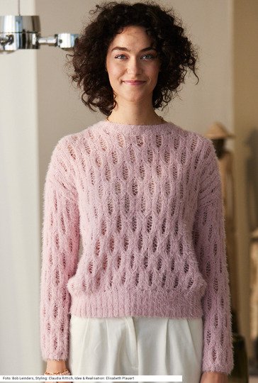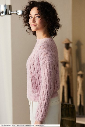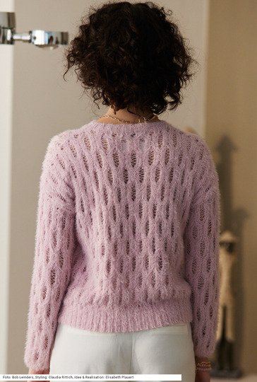 Trotz seines einfachen geraden Schnitts ist dieses Modell eher etwas für fortgeschrittene StrickerInnen, denn das Ajourmuster erfordert konzentrierte Aufmerksamkeit. Am Saum ist der Bund etwas höher, an den Ärmel ganz schmal und auch um den runden Halsausschnitt aus 2/2-Rippen gearbeitet. Das Modell wird aus einem wunderbar weichen Flauschgarn gestrickt, das zu Dreiviertel aus Bio-Baumwolle und zu einem Viertel aus recyceltem Polyamid hergestellt ist – das Polyamid ist für den Flaum verantwortlich. Eine Anleitung dazu gibt es für die Größen 38/40, 42/44 und 46/48.