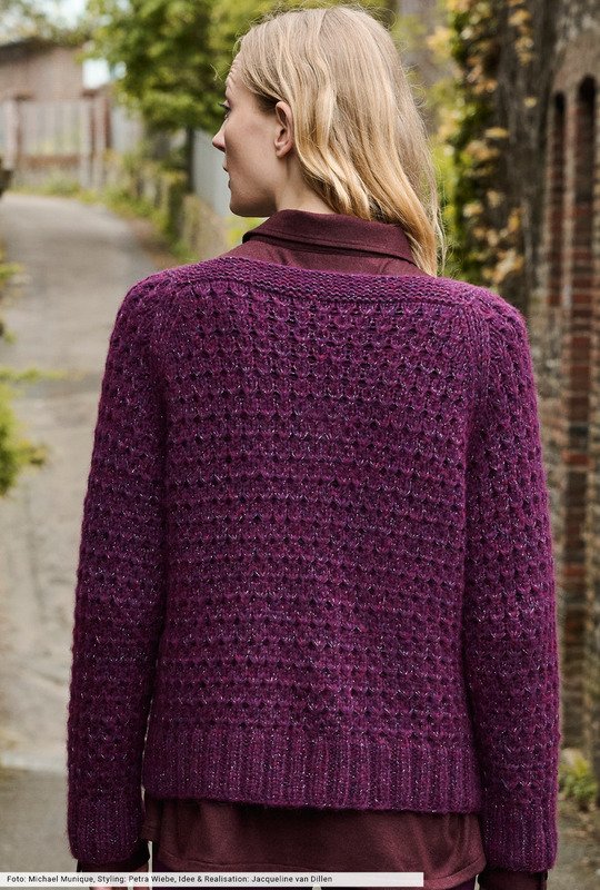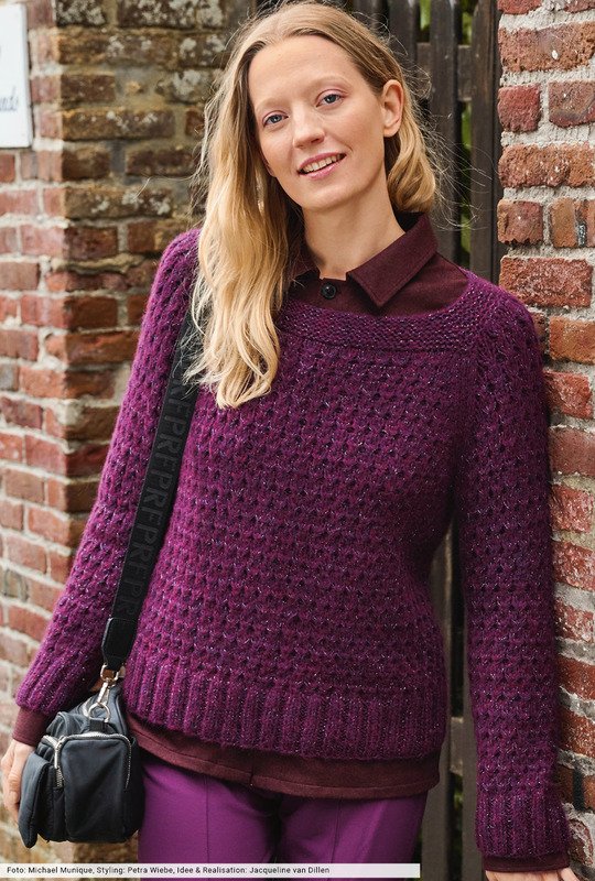 Bei metallischen Effekten muss es soft und cosy sein! Wie bei diesem lässigen Raglanpulli, bei dem wir weiches Alpaka-Baumwollgarn mit einem brillianten Glitzerfaden allover zusammen verstrickt haben. Das schlichte Lochmuster präsentiert sich in Karo-Optik, ist anfängerfreundlich und geht schnell von der Nadel. Außerdem lenkt es nicht ab von den schimmernden Effekten – denn das Selbstverständliche will delikat interpretiert werden.