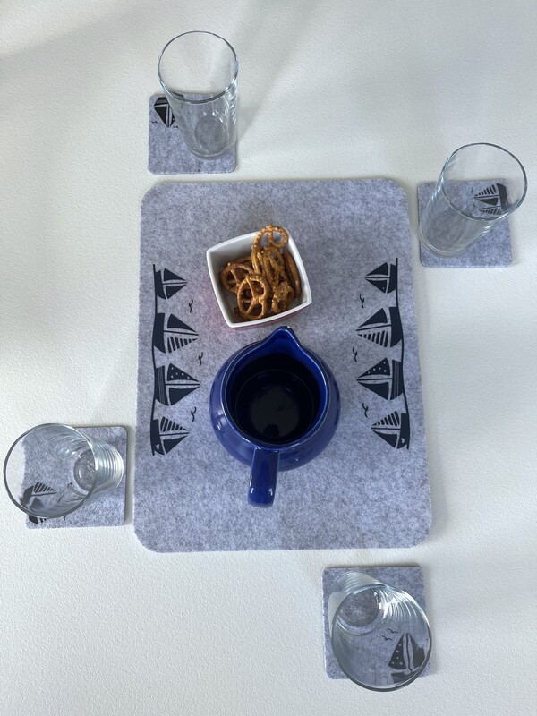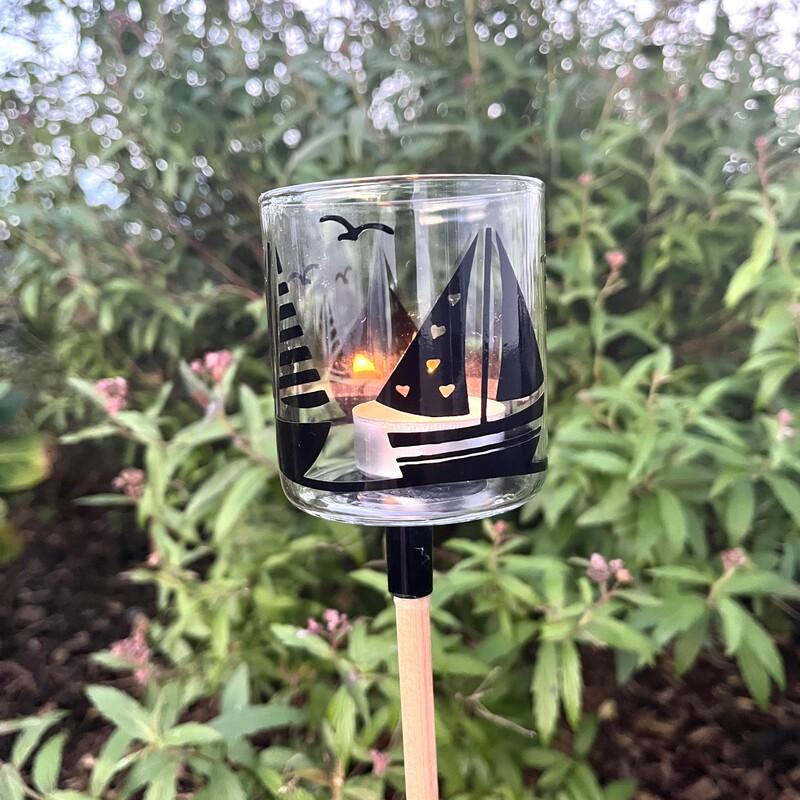 Geschnitten aus Vinylfolie verziert er Gläser und Porzellan und alle weiteren, glatten Oberflächen oder auch Karten, Geschirrtücher und Brotzeitbrettchen, Teelichter.