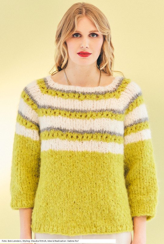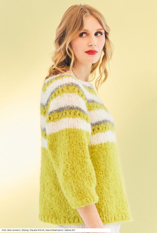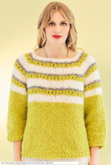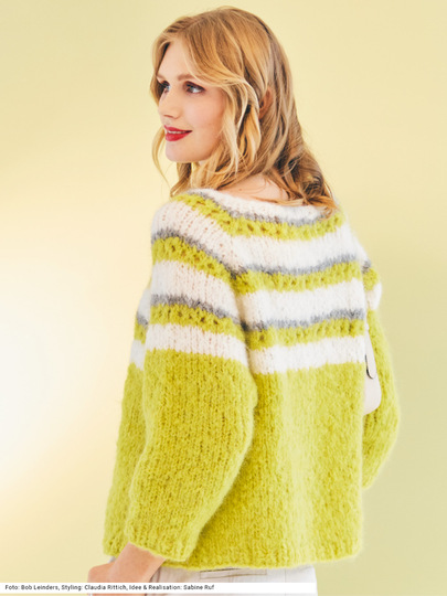 Dieser herrlich flauschige Pulli, der mit dicken Nadeln gestrickt wird, ist trotz Raglanschrägung vergleichsweise einfach zu stricken. Er wird in einem Stück von oben nach unten gearbeitet, ist also ein sogenannter RVO. Highlight des bequem geschnittenen Modells: das leuchtende Gelb, das einen frischen Kontrast zu den weißen und grauen Streifen bildet. Gestrickt wird hauptsächlich glatt rechts, bis auf ein paar schmale gelbe Streifen im Lochmuster und die Bündchen sowie Ausschnittblende im 1/1-Rippenmuster. Der Flausch kommt übrigens durch die Zusammensetzung des Garns zustande: Polyacryl, Polyamid, Mohair und Schurwolle. Die Anleitung dazu gibt es in den Größen 38/40, 42/44 und 46/48.