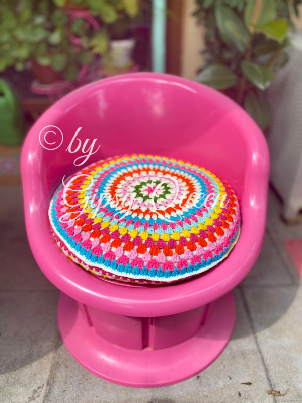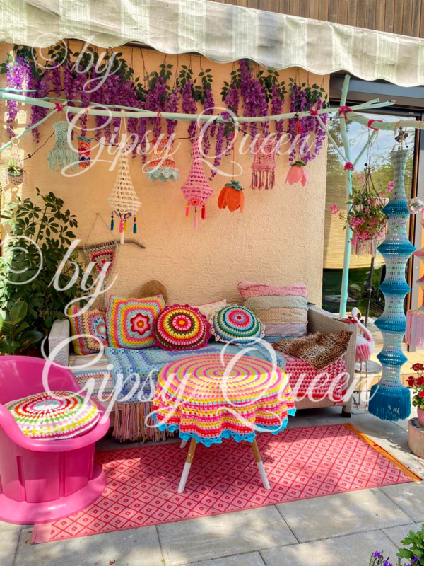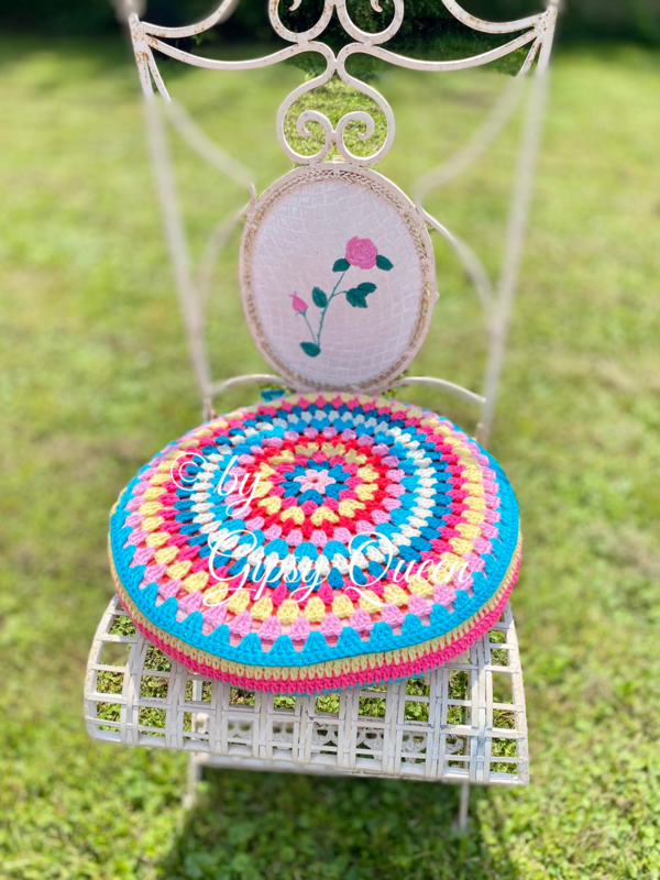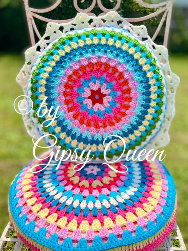 ein abnehmbarer Kissenbezug, ein Sitzpolsterbezug, ein Bodenkissenbezug, ein Sitzkissenbezug, ein Teppich und Tischset - alles gehäkelt mit Wolle geeignet für Nadelstärke 4