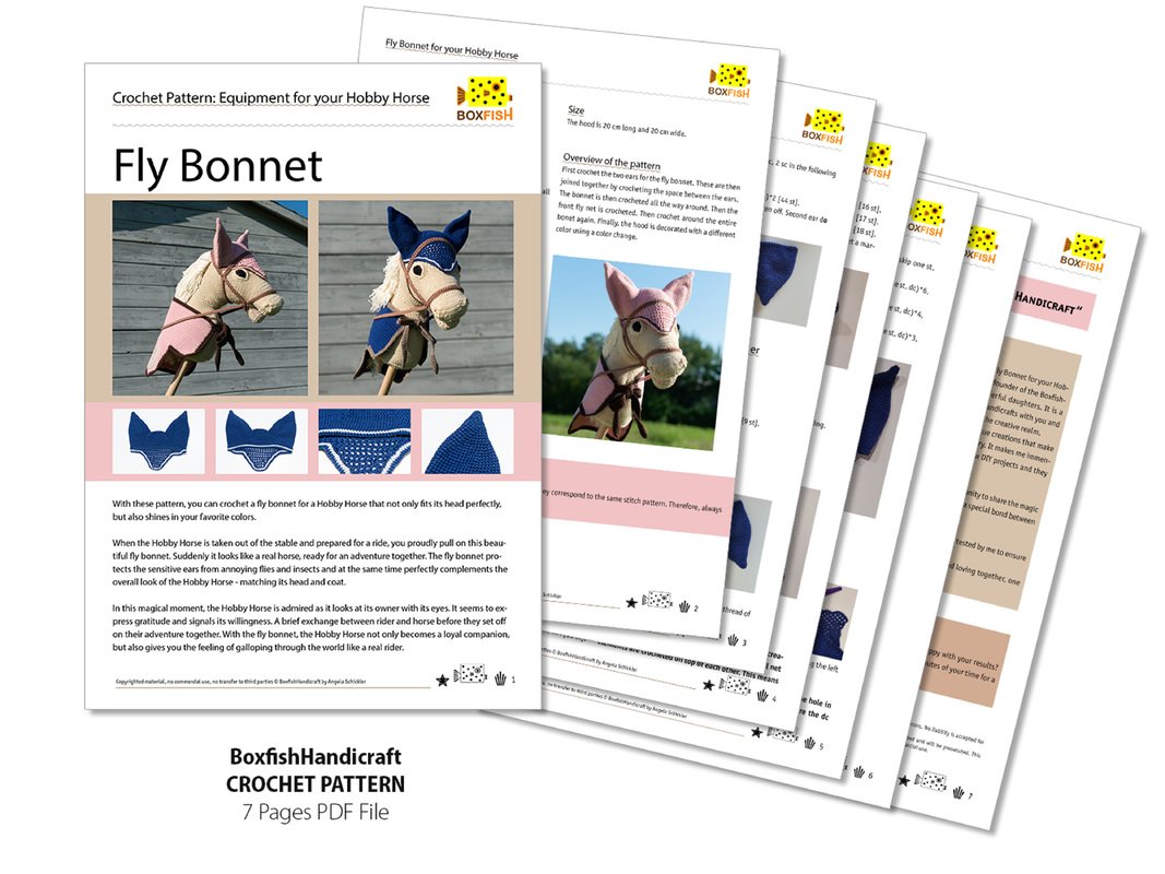 BoxfishHandycraft Häkelanleitung für die Fliegenhaube / Ohrenklappe / Fliegenmütze / Pferdemütze für ein Hobby Horse / Steckenpferd (PDF-Datei 7 Seiten).
