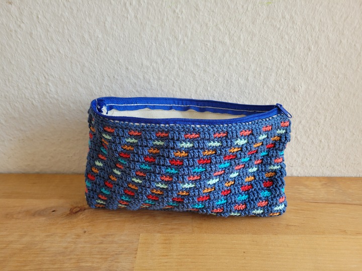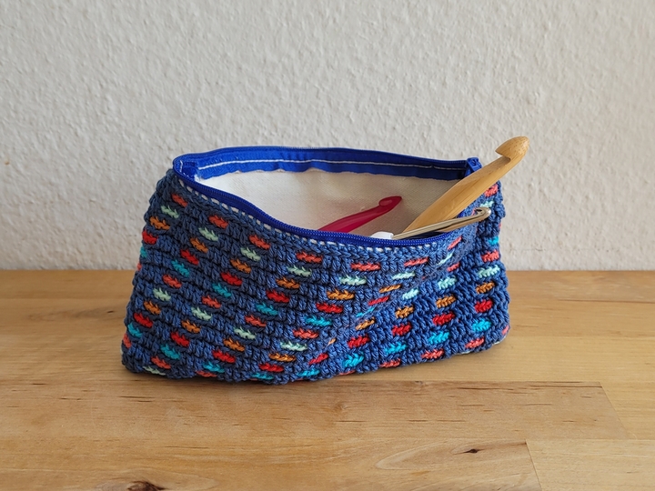 Ein buntes Täschchen für alle Fälle zum Aufbewahren von Häkelnadeln und anderen Kleinigkeiten. Selbst gehäkelt im angesagten Mosaikmuster. Und sehr geeignet, um Reste in deiner Baumwollgarn Abteilung zu verbrauchen.