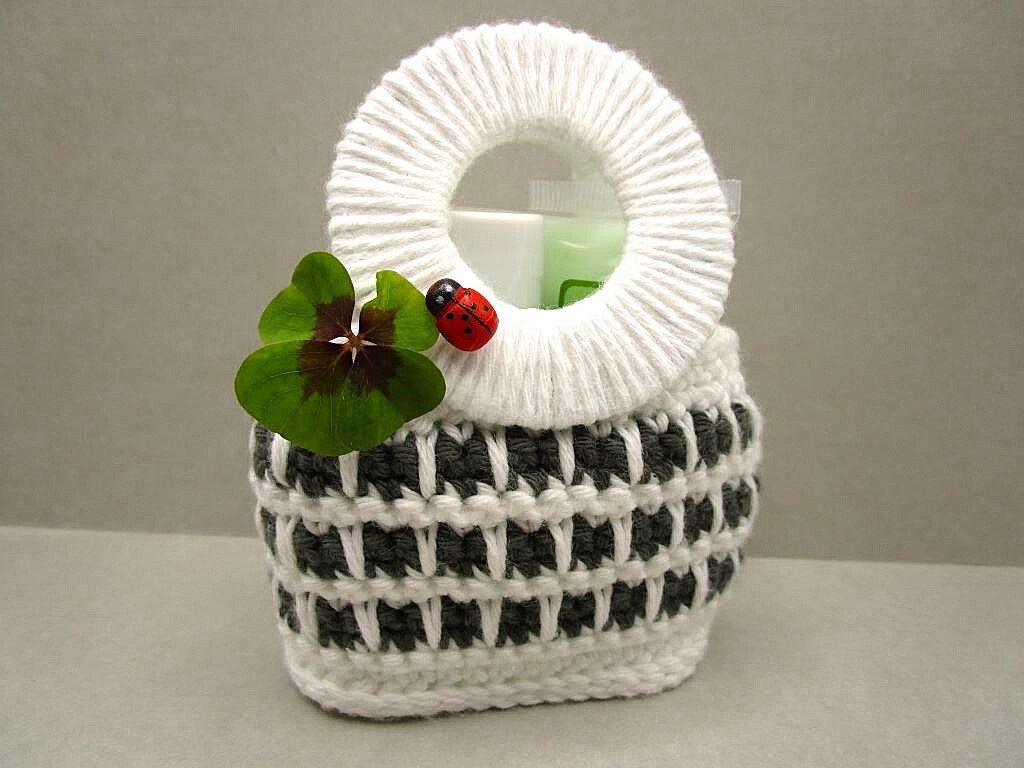 mit angegebenem Garn und Nadeln Länge: ca. 8cm Breite: ca.3,5cm Höhe mit Henkel: ca. 11 cm
