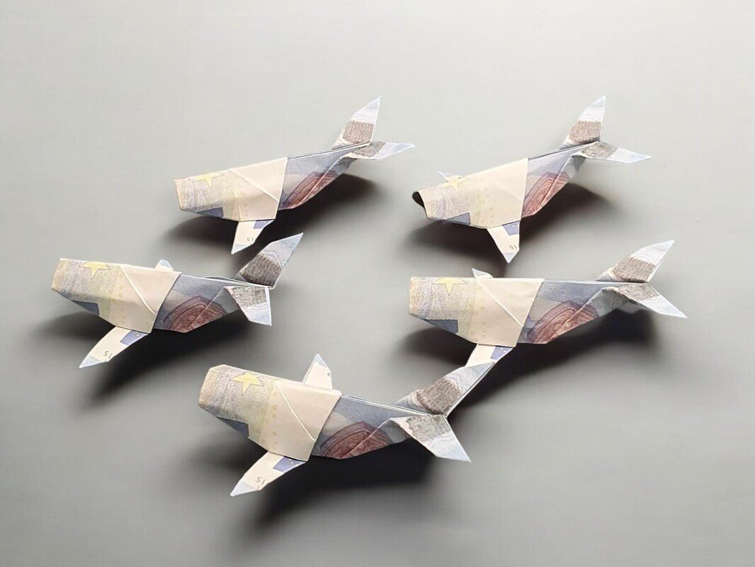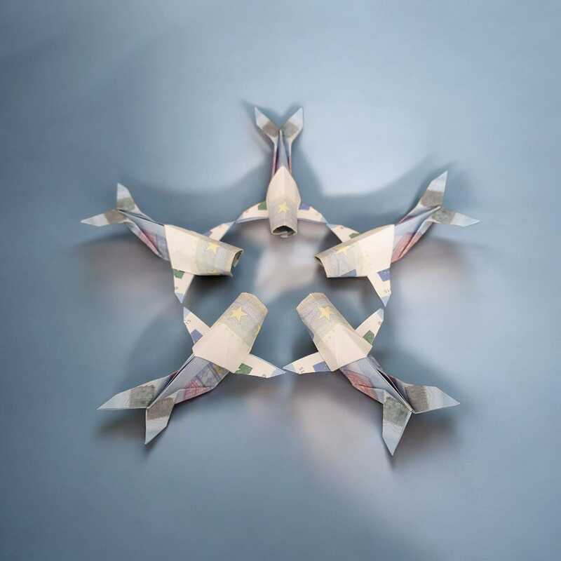 Dieser dreidimensionale Origami-Wal ist aus einem Geldschein gefaltet. Er ist eine sehr realistische Darstellung eines Wals. Er kann aus jedem Euro-Geldschein oder jeder anderen Währung gefaltet werden. Hier auf dem Foto ist er aus je einem 20-Euro-Schein gefaltet.