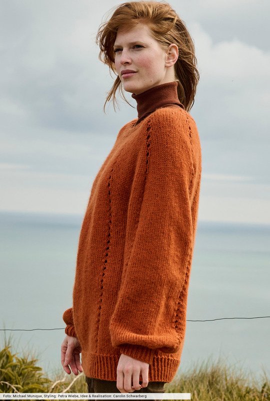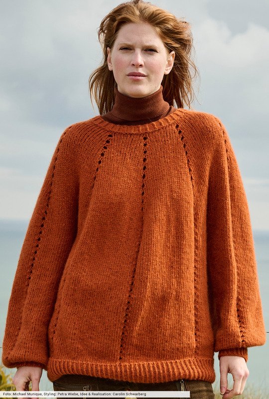Orange zählt zu den Trendfarben in der Herbstsaison und kommt in intensiv-knalligen Nuancen daher, wie hier in "Dragon Fire". Da kann man dann auch auf schwierige Muster verzichten und kreiert einen von oben nach unten und in Runden gestrickten Pulli, bei dem viel Glatt-rechts-Flächen und einige Lochmusterstreifen zum Einsatz kommen. Alles ganz easy, nur bei den Zunahmen für die Gesamtweite heißt es aufgepasst, aber das haben wir in der Anleitung genau beschrieben