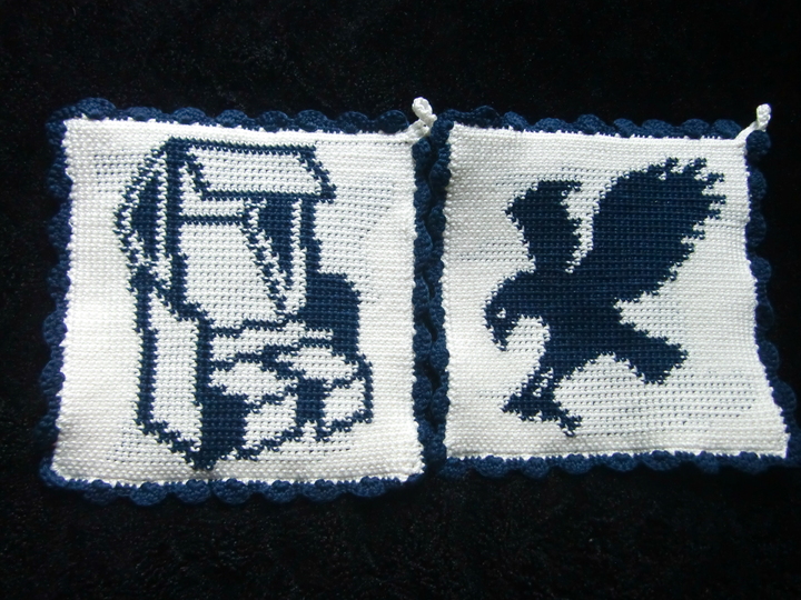An Material benötigen Sie für ein Paar Topflappen wie abgebildet 2 Knäul in natur und 1 Knäul in dunkelblau, bei gleichmäßiger Farbverteilung (eine Seite heller Hintergrund, eine Seite dunkler Hintergrund) je 2 Knäul Wolle in zwei Farben, also insgesamt ca. 4 Knäul Wolle (z. B. Schachenmayr Catania oder vergleichbare Qualität) sowie eine zur Dicke der Wolle passende Häkelnadel.