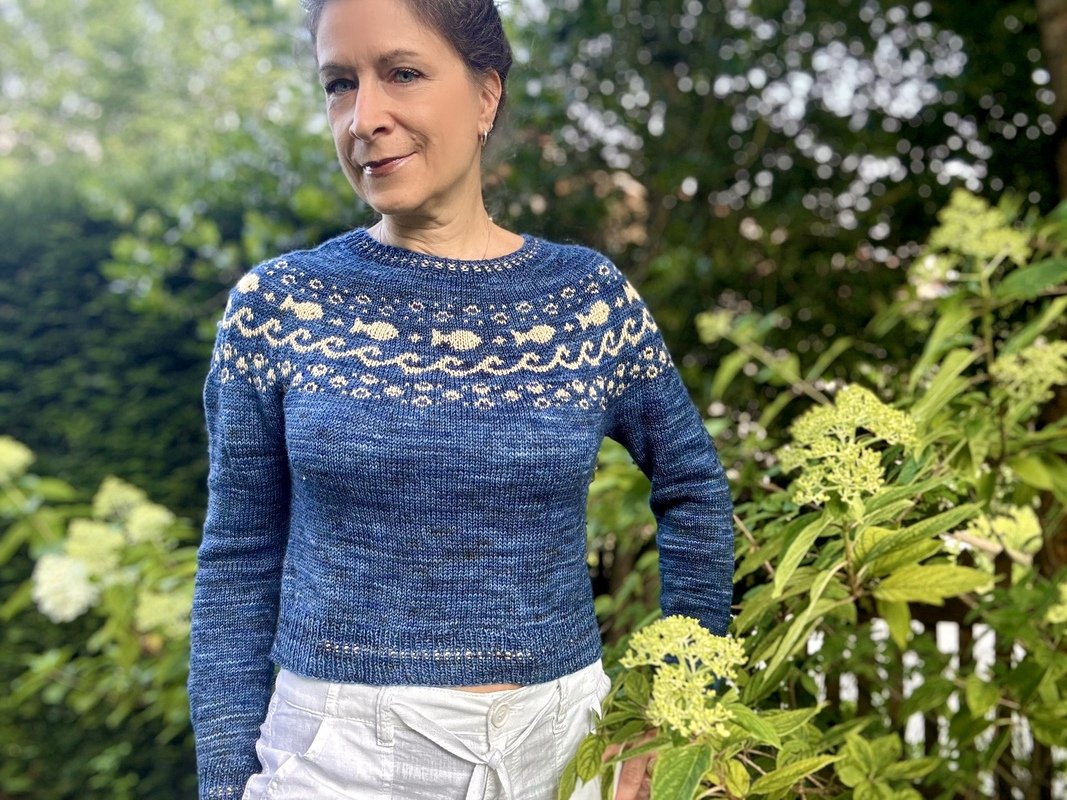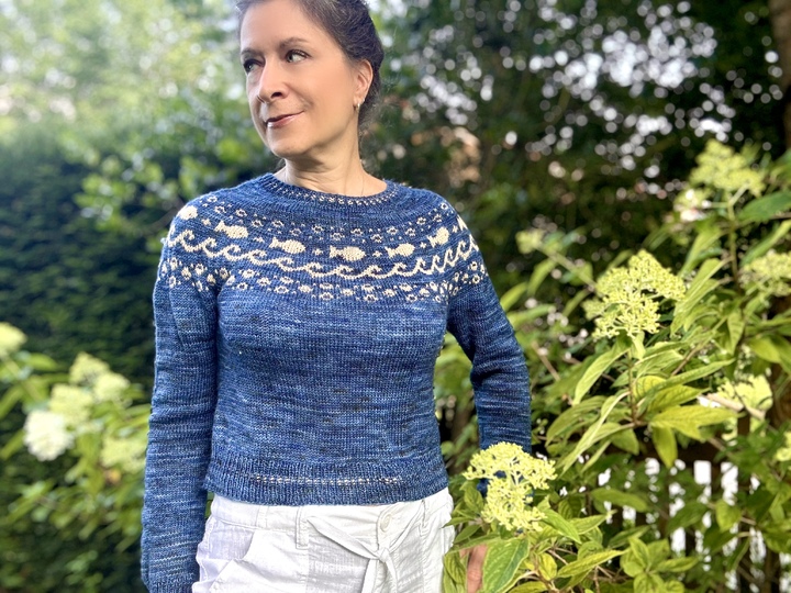 SHARKY ist ein klassischer Rundpassenpullover mit einem maritimen Einstrickmuster. Die leuchtenden Farben machen dieses Oberteil zu einem absoluten Hingucker! Ich habe ein wunderschönes Blau als Grundfarbe gewählt, da es mit seinem Farbspiel für mich perfekt die Unterwasserwelt widerspiegelt. Kleine Details an den Bündchen greifen die Farben des Musters nochmals auf und sorgen für Abwechslung beim Stricken.