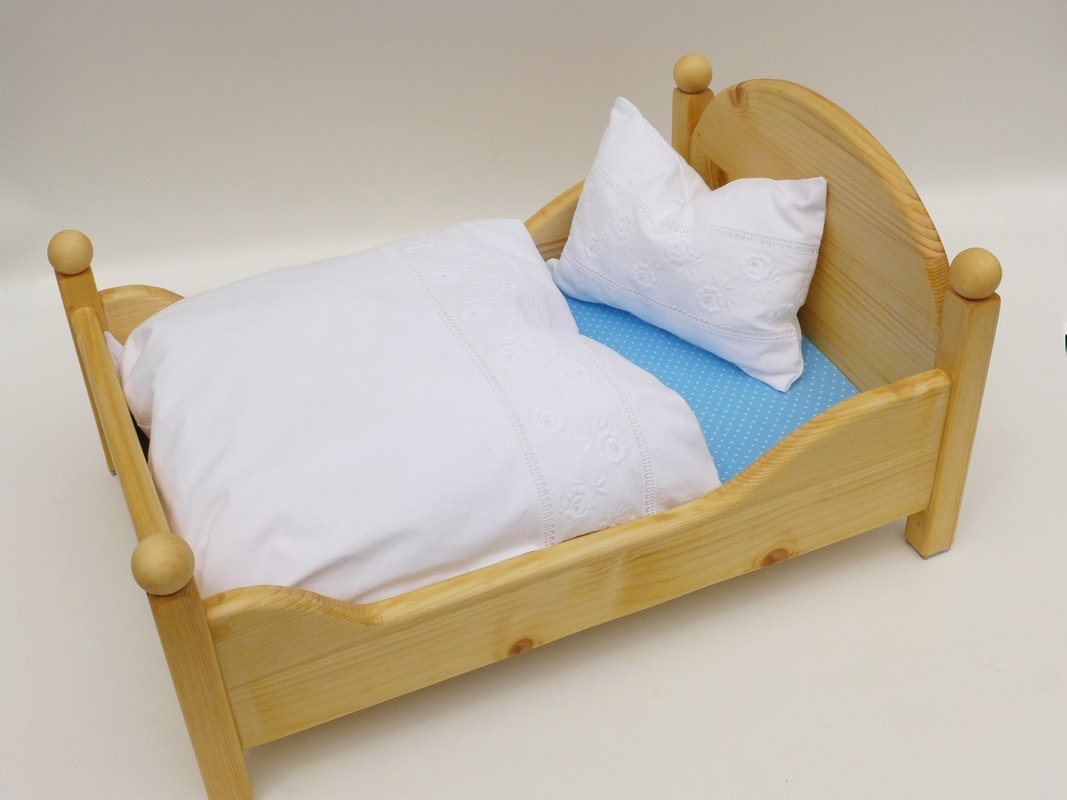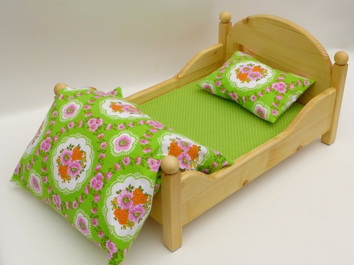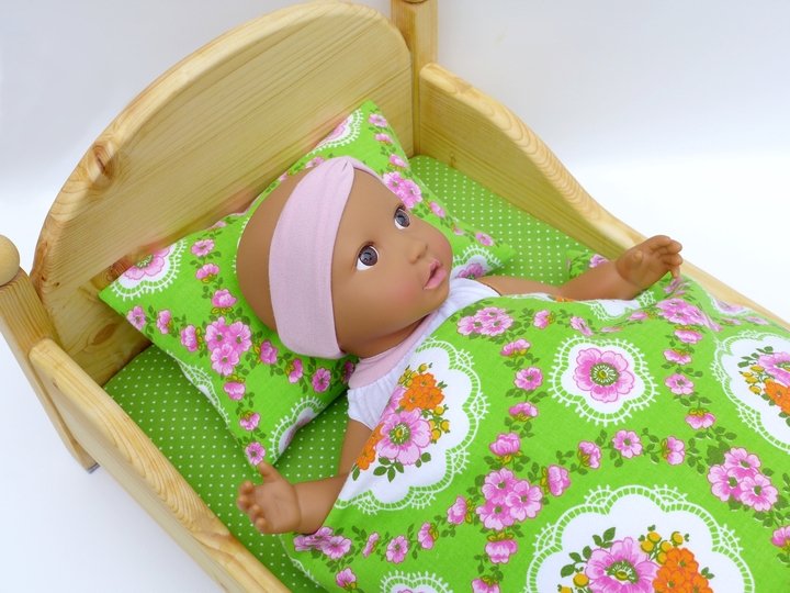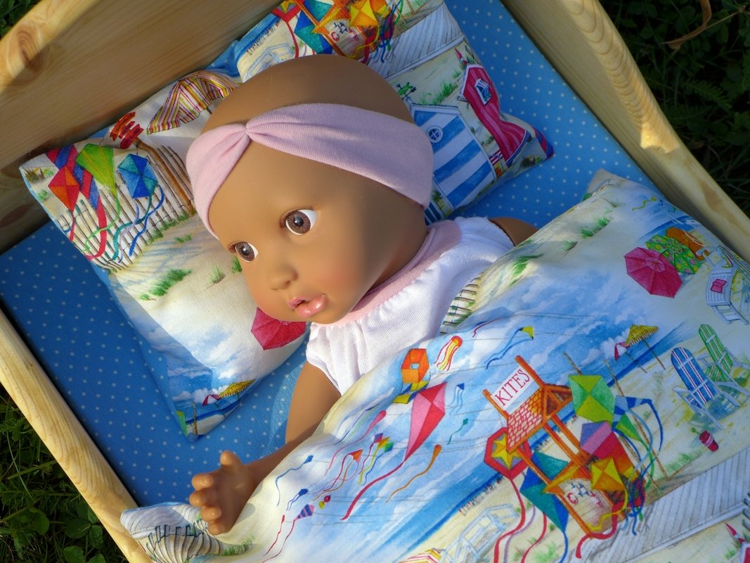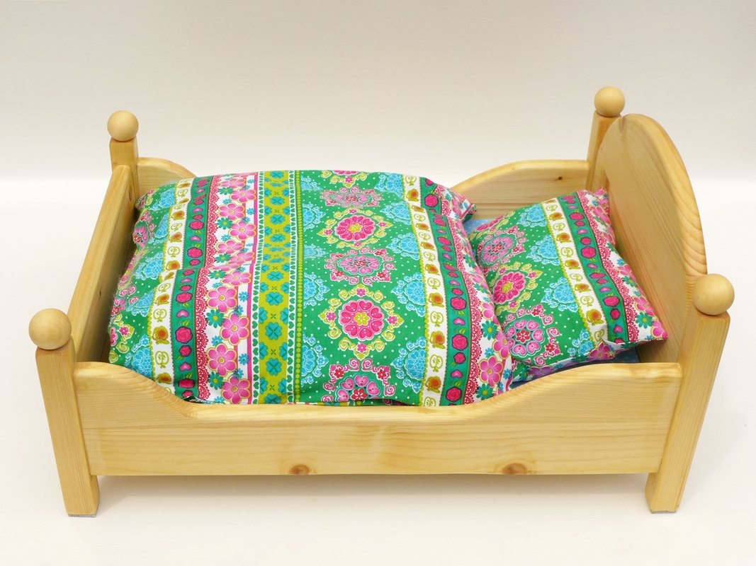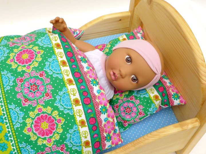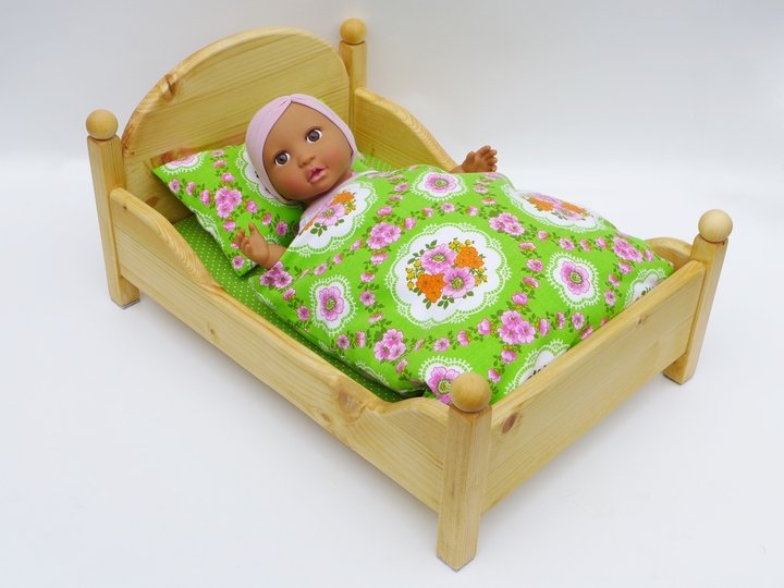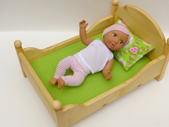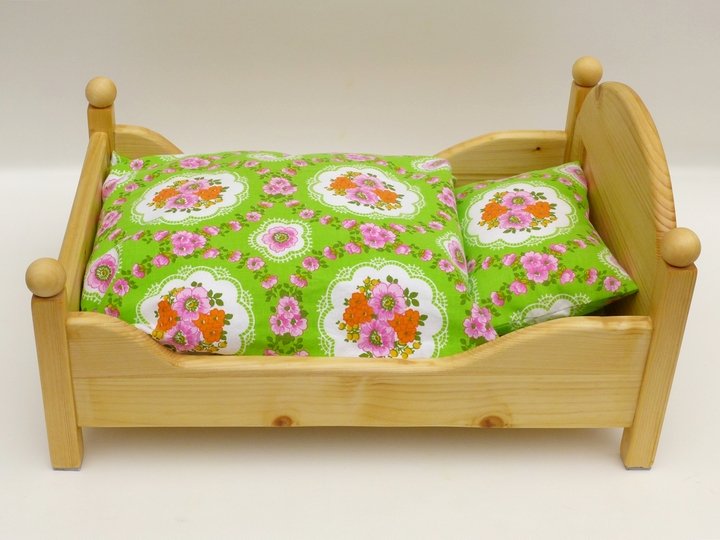 Meine Bettwäsche passt ideal auf mein selbstgebautes Puppenbett. Mein Puppenbett hat eine Liegefläche von 44 x 30 cm. Darin fühlen sich Puppen bis 42 cm Größe wohl. Man kann die Bettwäsche aber an jede beliebige Bettengröße anpassen.