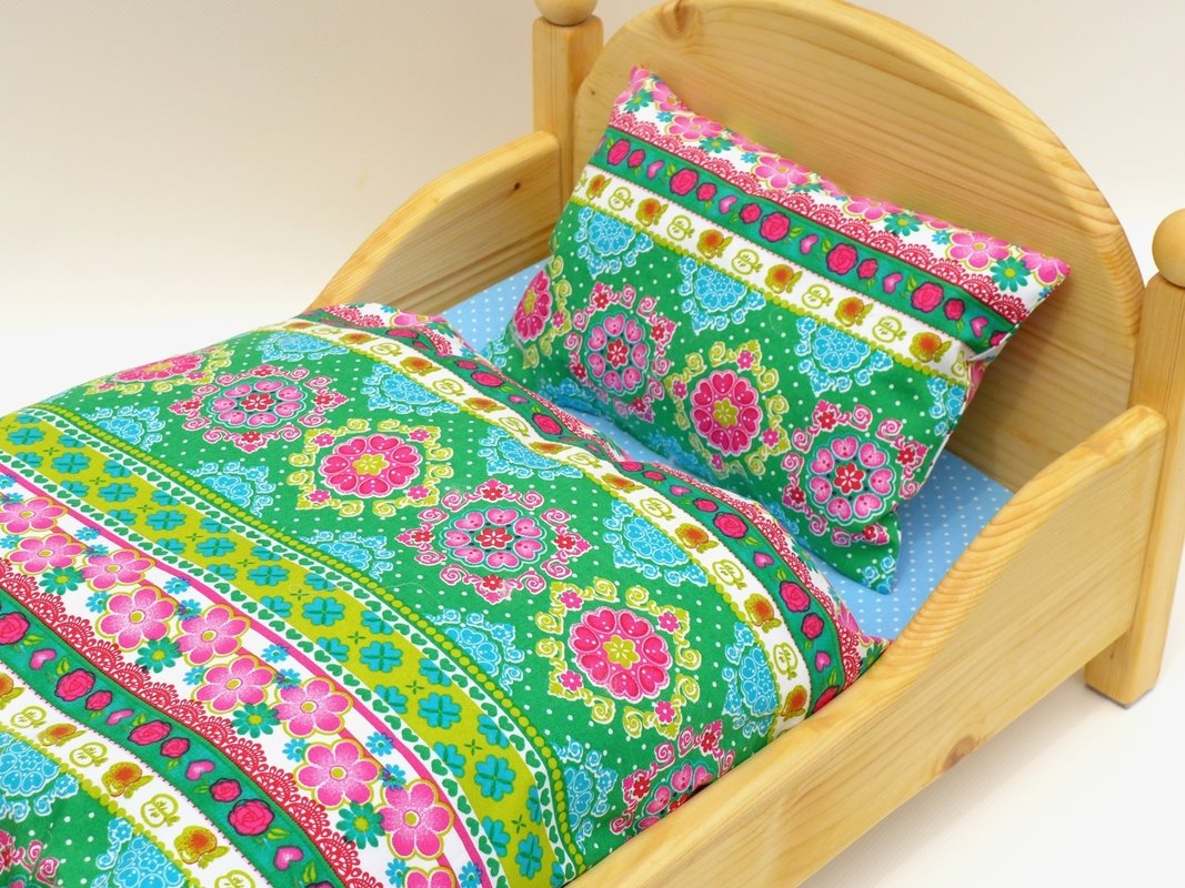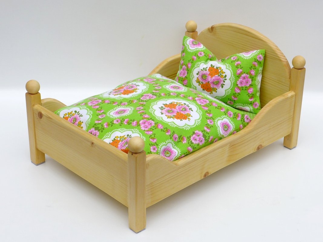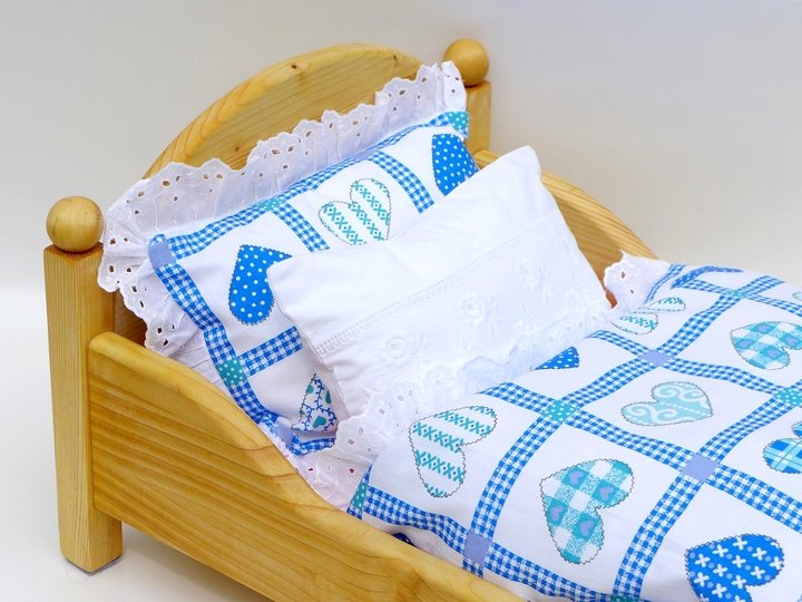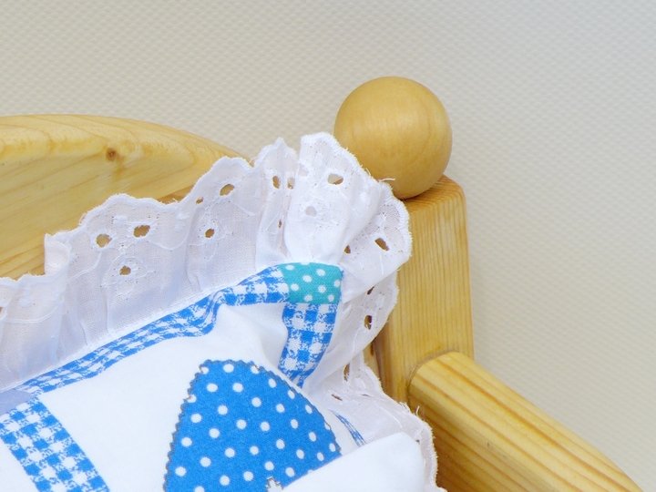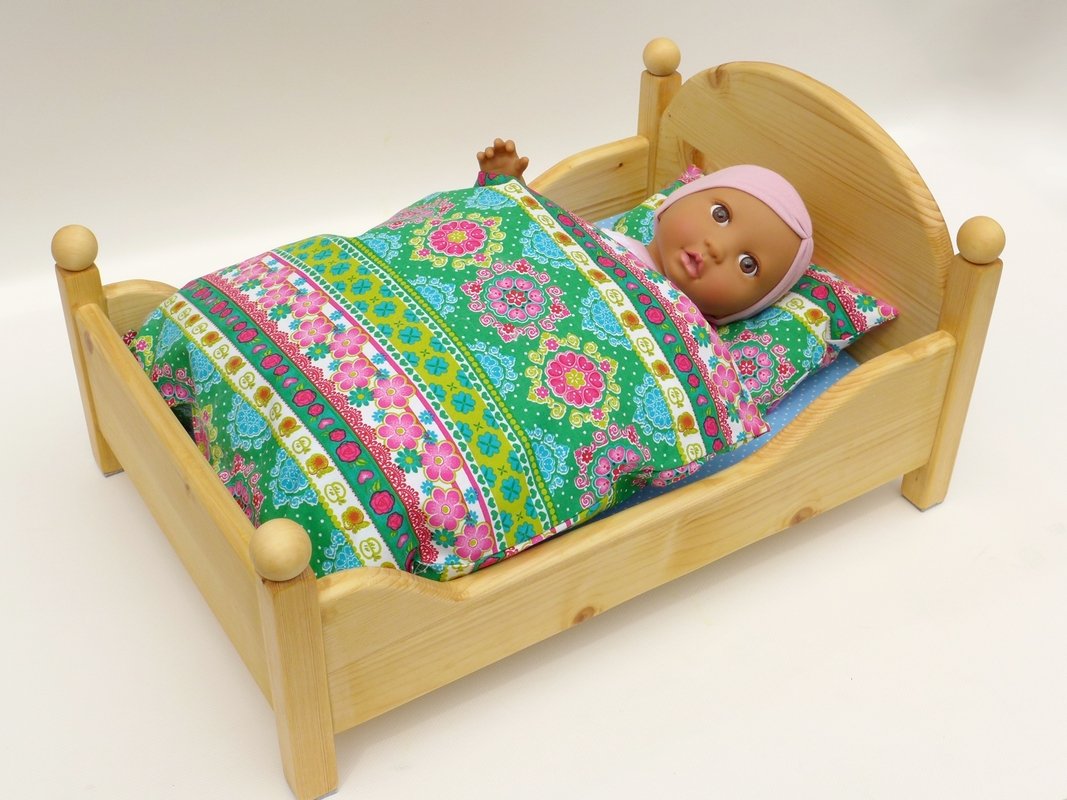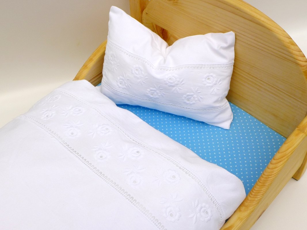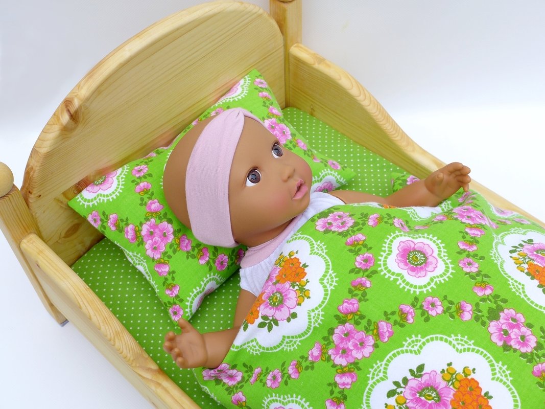 Meine Bettwäsche passt ideal auf mein selbstgebautes Puppenbett. Mein Puppenbett hat eine Liegefläche von 44 x 30 cm. Darin fühlen sich Puppen bis 42 cm Größe wohl. Man kann die Bettwäsche aber an jede beliebige Bettengröße anpassen.