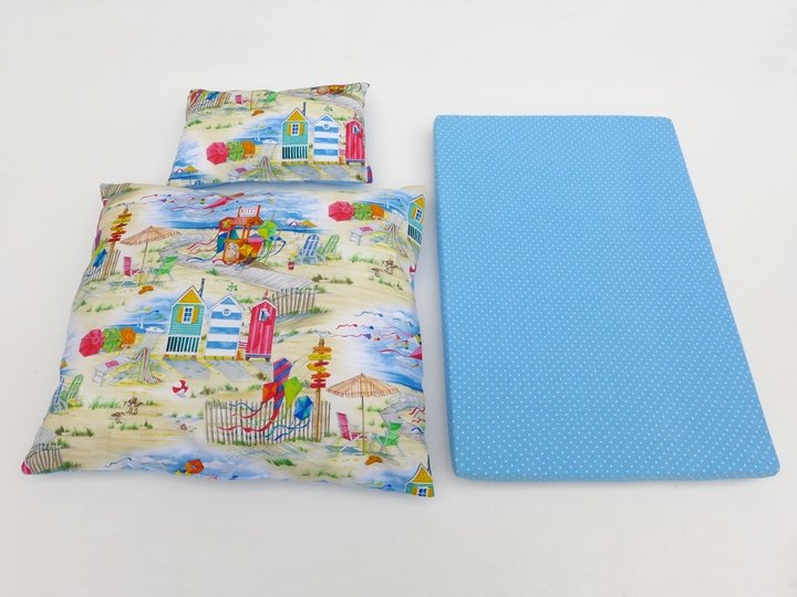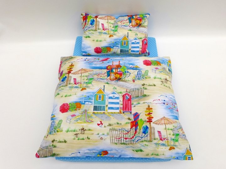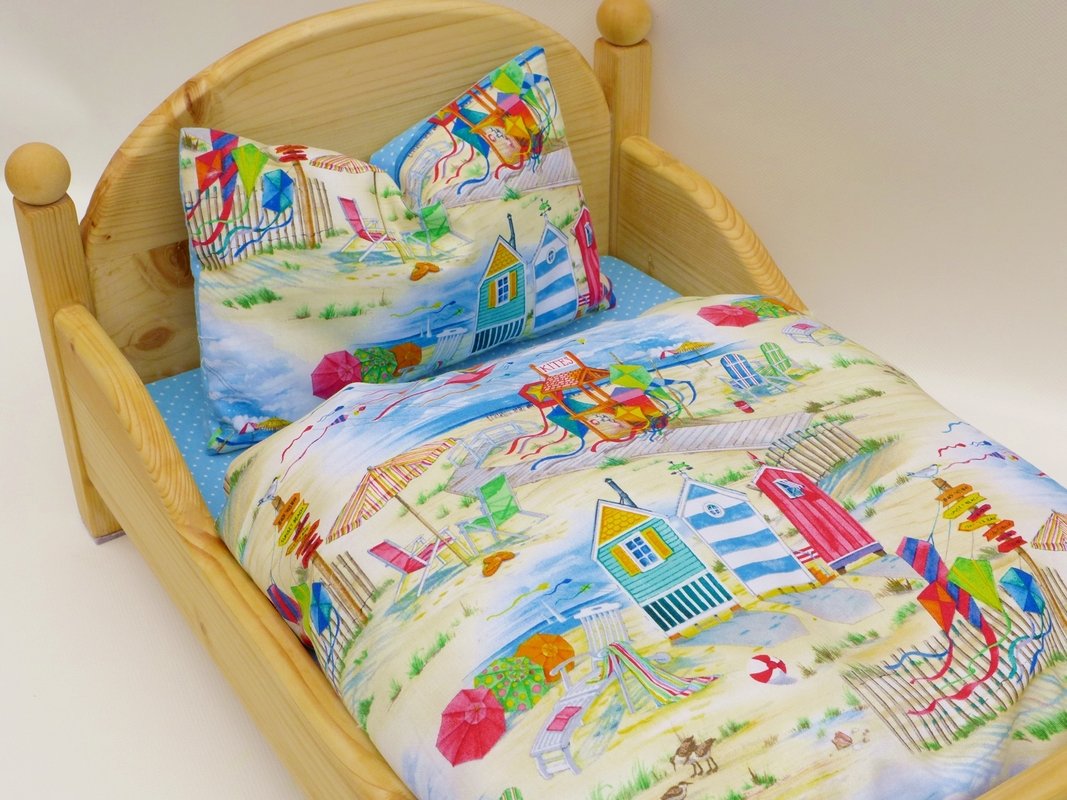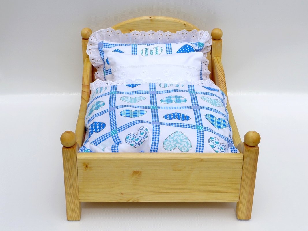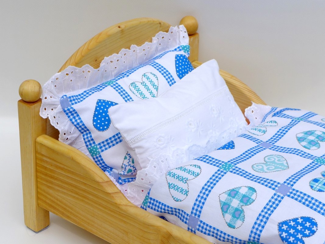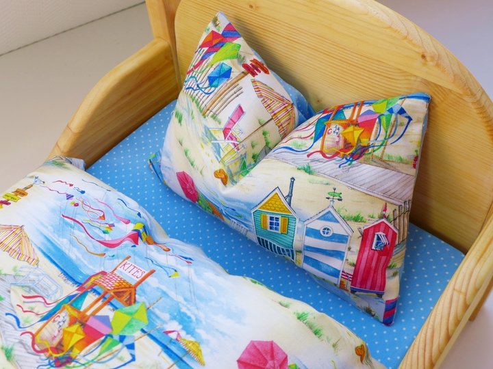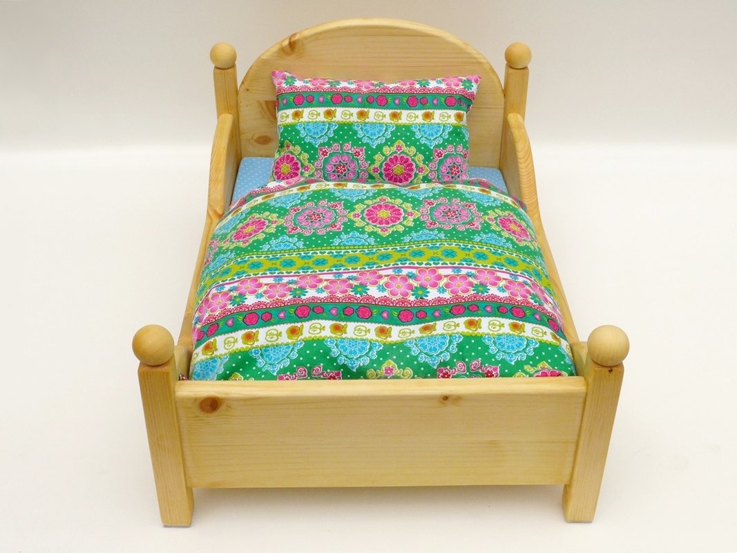 Meine Bettwäsche passt ideal auf mein selbstgebautes Puppenbett. Mein Puppenbett hat eine Liegefläche von 44 x 30 cm. Darin fühlen sich Puppen bis 42 cm Größe wohl. Man kann die Bettwäsche aber an jede beliebige Bettengröße anpassen.