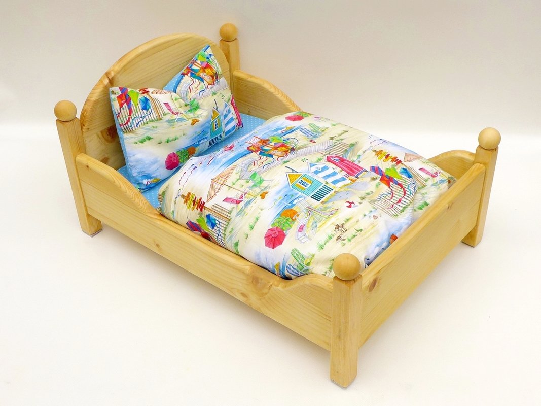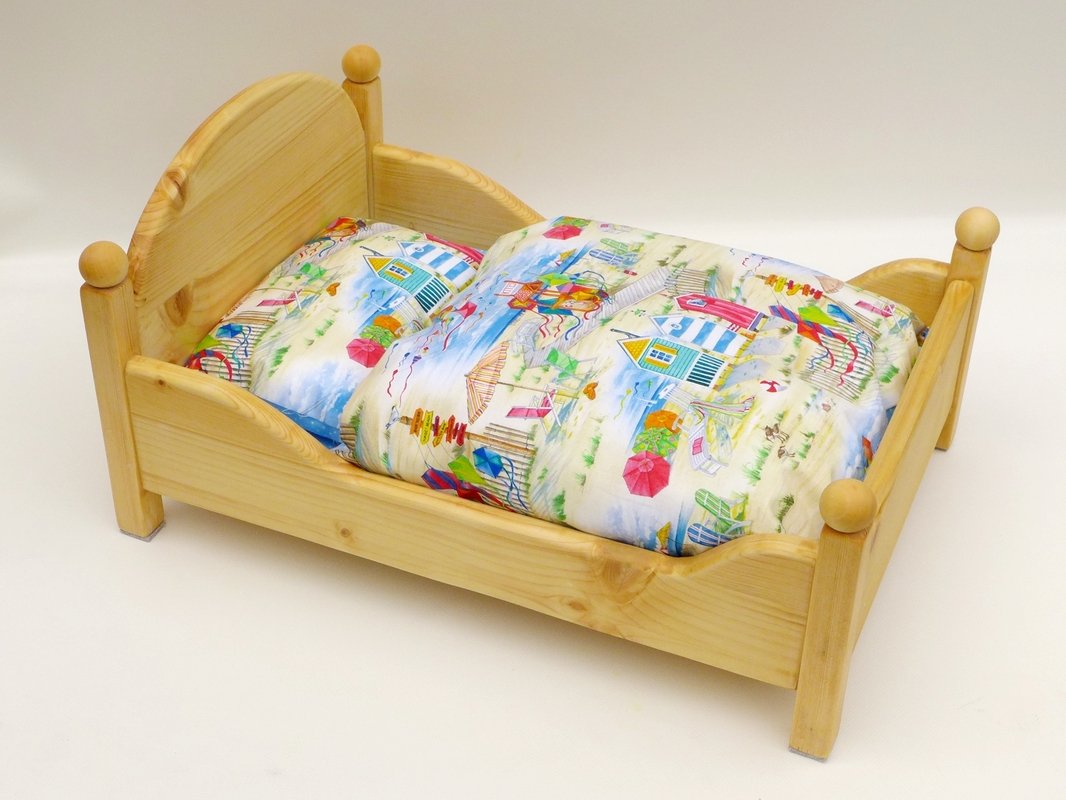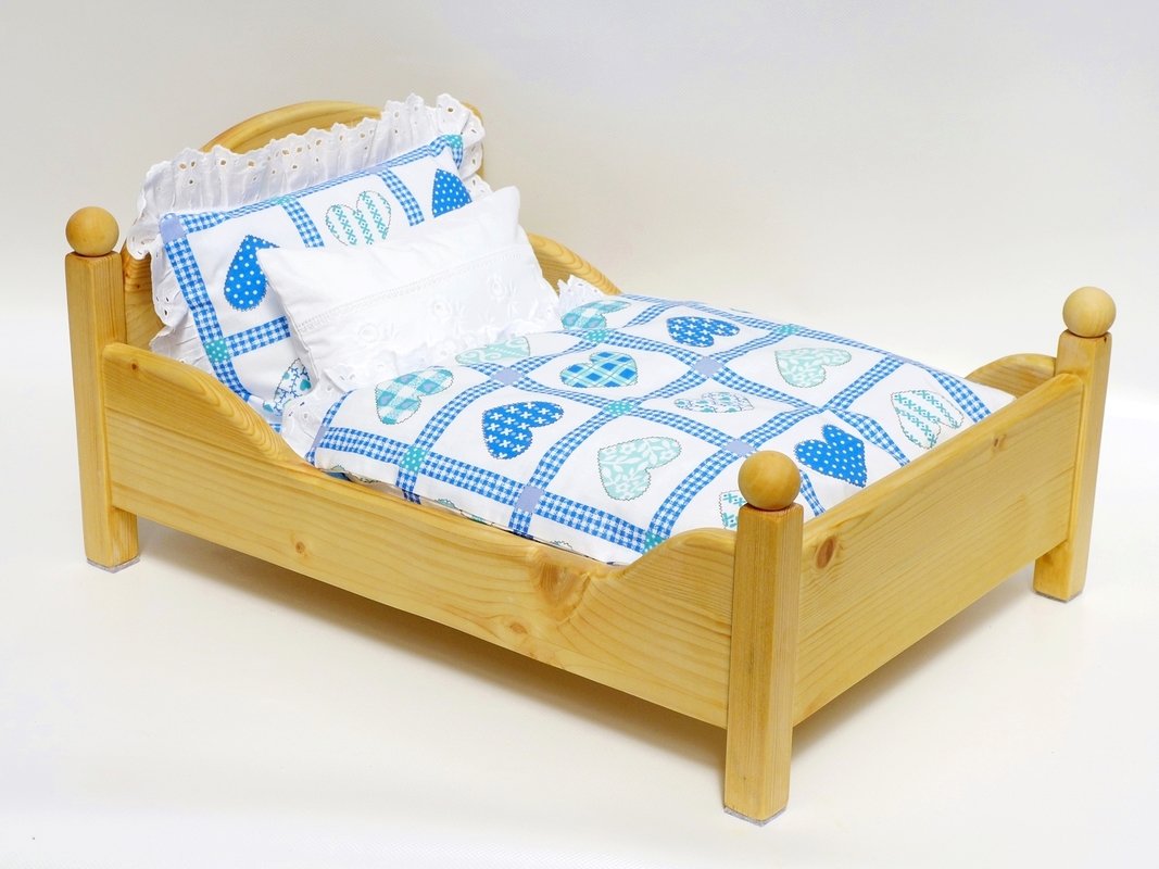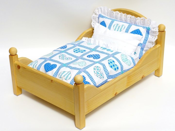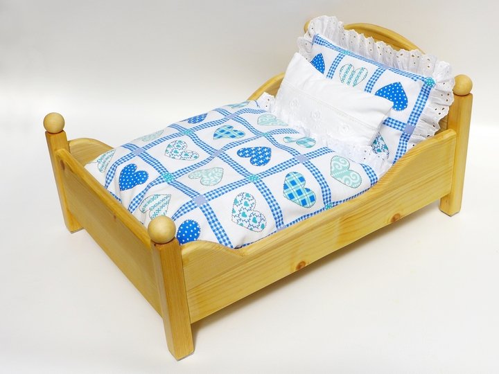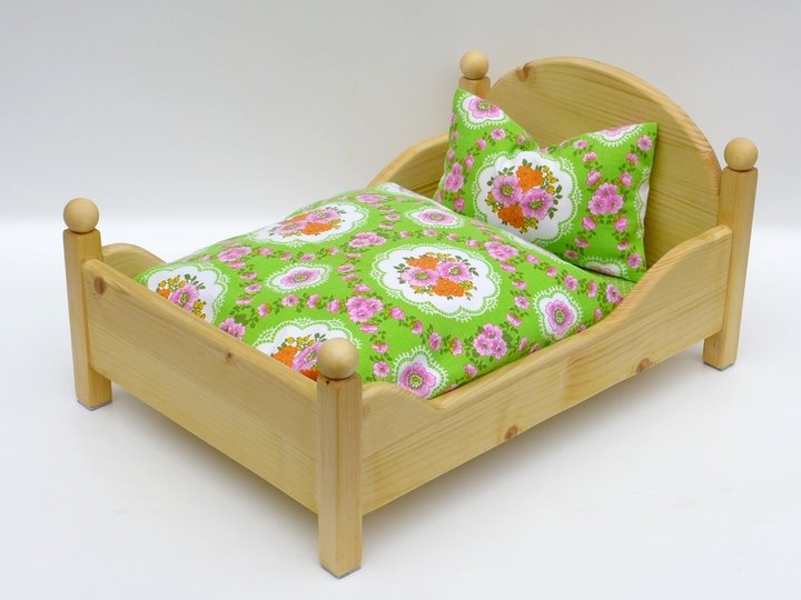 Das gezeigte Puppenbett aus Echtholz könnt Ihr auch selber fertigen. Die separate Bauanleitung gibt es in meinem Shop. Dort findet sich auch eine Kombi-Anleitung mit Preisvorteil, die die Bau- und Nähanleitung beinhaltet.