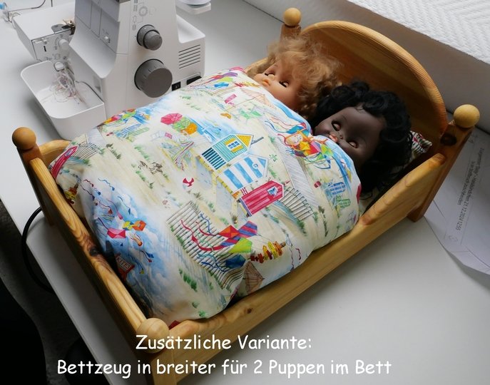 Zuerst nähen wir ein Basismodell. Danach gibt es ein paar Ideen für weitere Varianten. Besonders ausführlich habe ich Euch die Variante "Bettwäsche mit Rüsche" beschrieben, da das mein Lieblingsmodell ist. Das sieht so schön romantisch und verspielt aus, da möchte man gern selber wieder Kind sein und mit Puppen spielen.