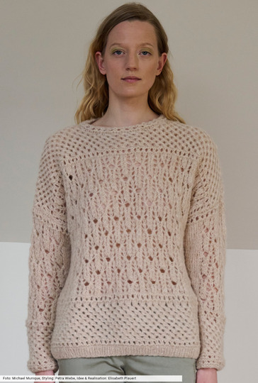 Superleichtes Flauschgarn bietet eine großartige Möglichkeit, jedem Outfit sofort Charakter zu verleihen. Zum Beispiel mit diesem bezaubernden Oversize-Pulli in neutraler Beige-Nuance. Der Augenmerk liegt natürlich auf dem extravaganten Mustermix, bei dem Netz- und Ajourstrukturen zum Einsatz kommen und zu dessen Gelingen schon etwas Strickerfahrung vorhanden sein sollte. Rippenblenden für Vorder- und Rückenteil, schmale Kraus-rechts-Kanten für die Ärmel und ein Lochmusterstreifen als Halsblende bilden den fantasievollen Rahmen.
