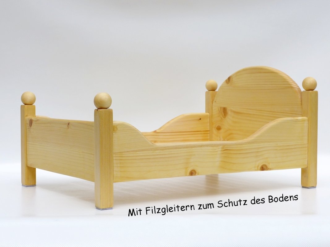 Idealerweise gibt es einen Opa, der das Puppenbett aus Echtholz in seiner Hobbywerkstatt für das Enkelkind werkelt, und die Oma näht aus alten Lieblingsstoffen und Spitze die Bettwäsche. Aber vielleicht habt Ihr auch andere begabte Menschen in Eurer Umgebung, die dieses schöne Puppenspielzeug gern fertigen würden.
