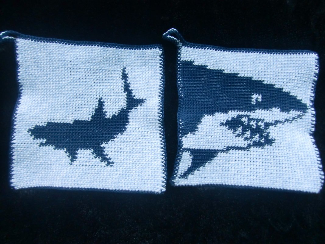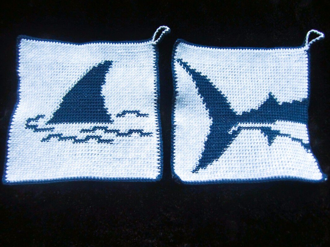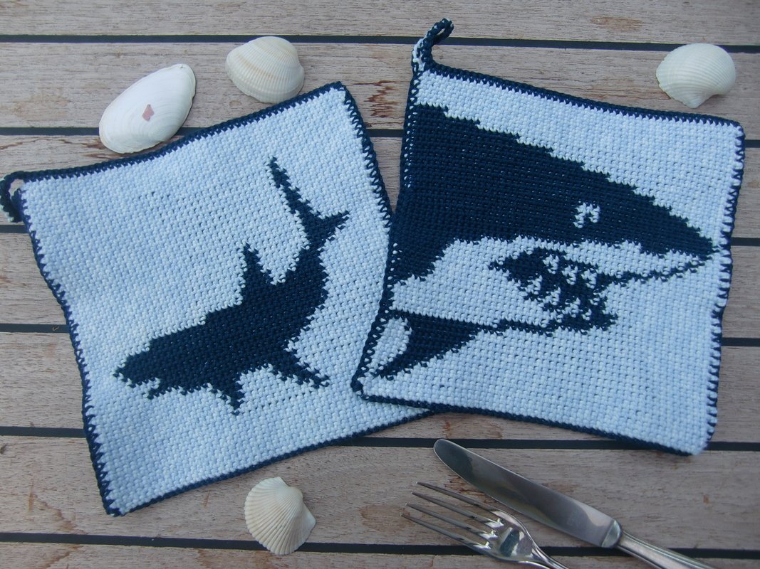 Sie lieben das Meer und seine Bewohner? Wer sich ein wenig Urlaub nach Hause holen möchte, kann dies mit den in Doubleface-Technik gehäkelten Topflappen wunderbar tun. Bei dieser Technik ist es möglich, auf beiden Seiten gänzlich unterschiedliche Motive zu häkeln. Die Anleitung dieser Topflappen enthält 4 verschiedene Hai-Motive (Silhouette, Rückenflosse, Kopf, Schwanz).