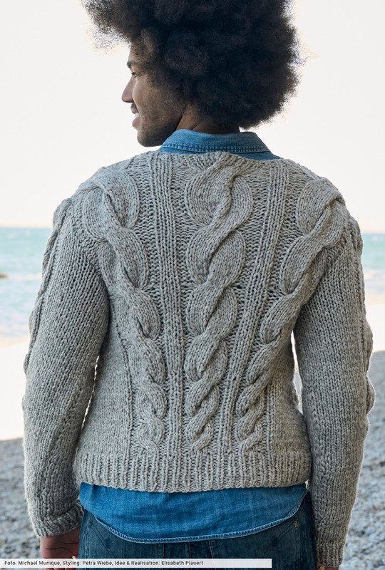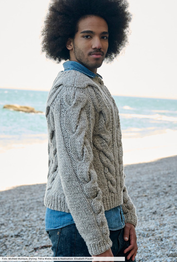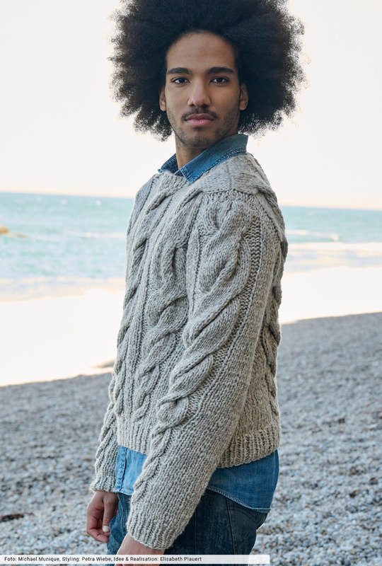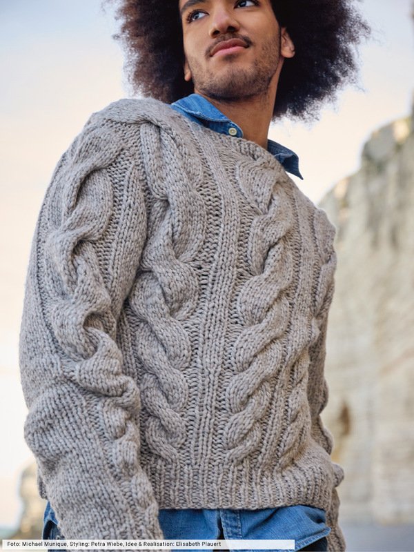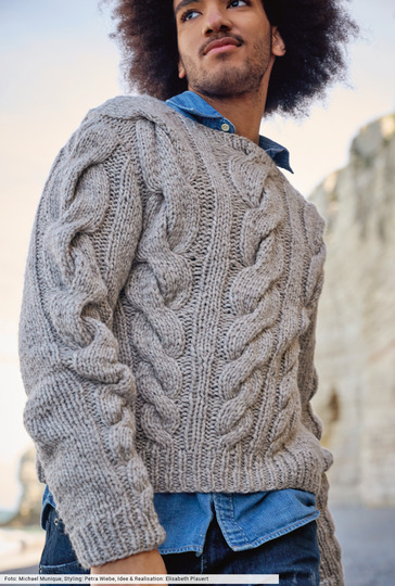 Das ist sein absolutes Lieblingsstück, denn die Musterführung der Zöpfe ist einzigartig. Die V-förmige Optik gelingt durch die Zunahmen innerhalb der Zöpfe, die Gesamtbreite von Vorder- und Rückenteil wird jedoch durch seitliche Abnahmen konstant gehalten. Das voluminöse Schurwollgarn wird mit Baumwoll- und Yakfasern kombiniert und kann auch noch in vielen anderen Farben bestellt werden. Klassische Rippenbündchen und der gerade U-Boot-Ausschnitt bilden das Finish.
