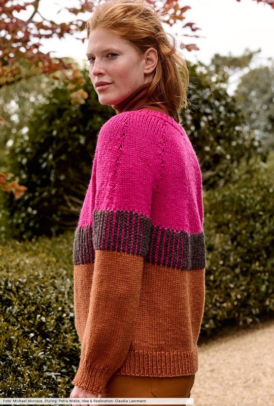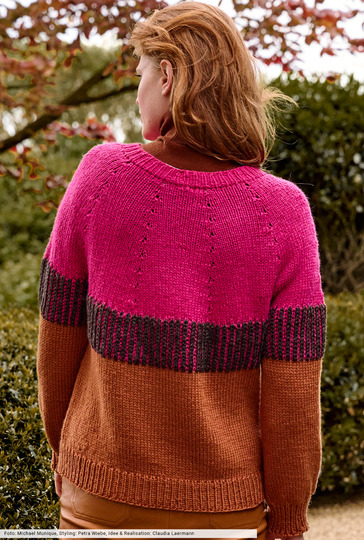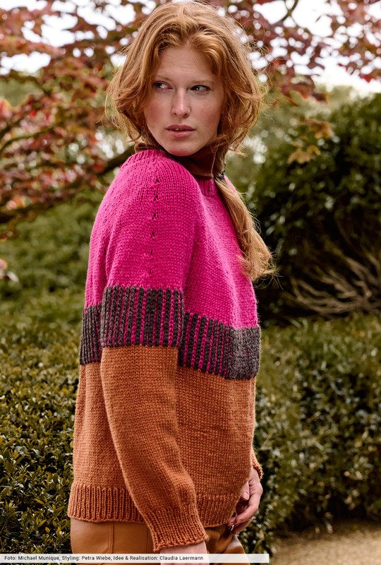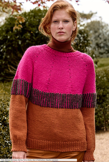Nahtlos stricken kommt nie aus der Mode und ist einfacher als es aussieht. Hier als stilvoller Pulli, der von oben nach unten und größtenteils glatt rechts gestrickt wird. Dazwischen sorgt die Passe im zweifarbigen Patentmuster für Spannung und bildet einen starken Kontrast zum zimtbraunen unteren Teil und zum pinkfarbenen oberen Teil des Pullis. Aus edlem Schurwoll-Alpakagarn ein Stück fürs Leben!