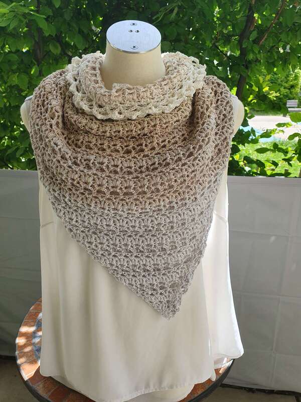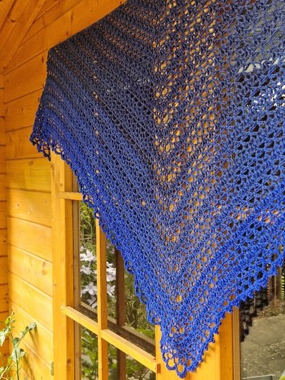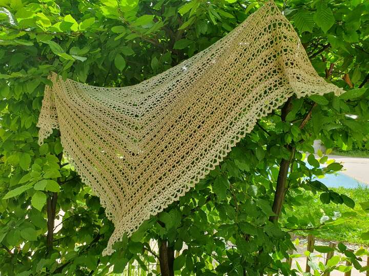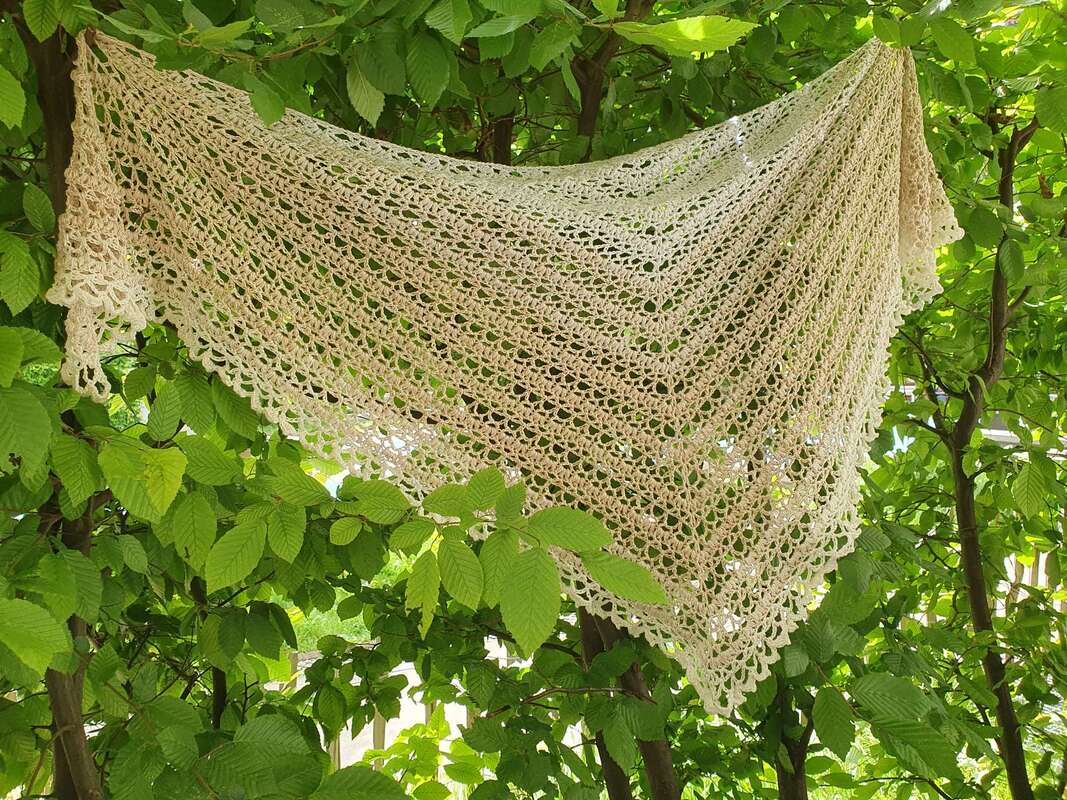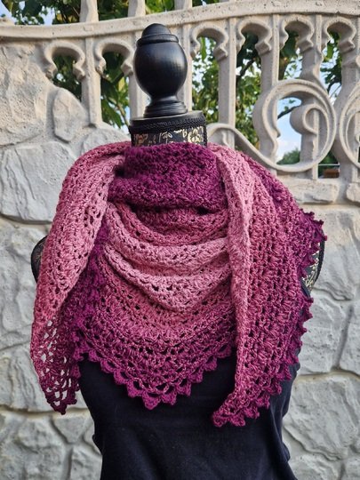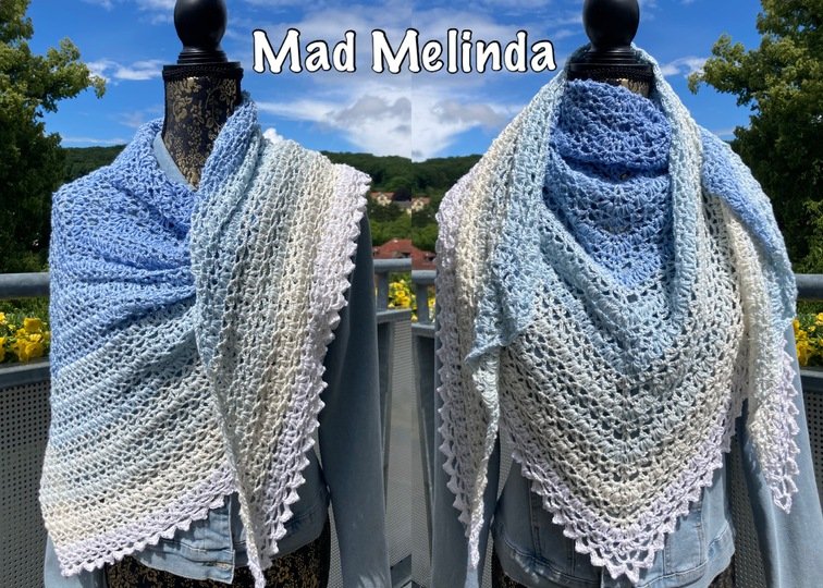 Mad Melinda ist ein zauberhaftes Dreieckstuch mit einem luftigen Charakter und effektvollen Muster, das von Halskante abwärts gehäkelt wird.