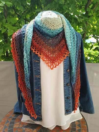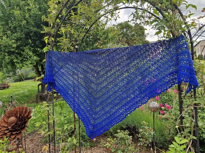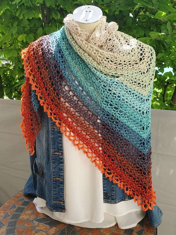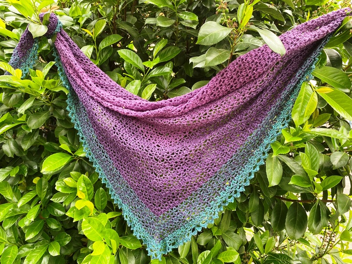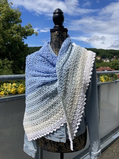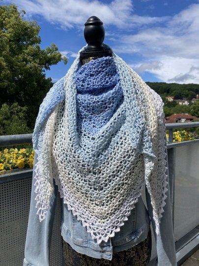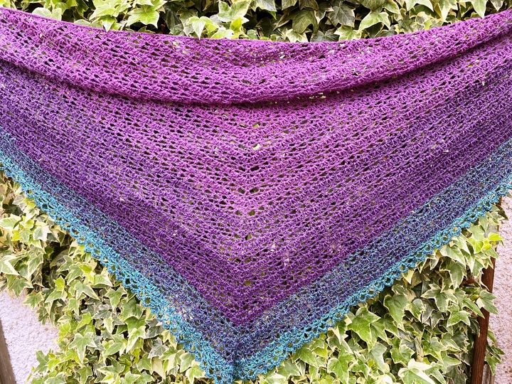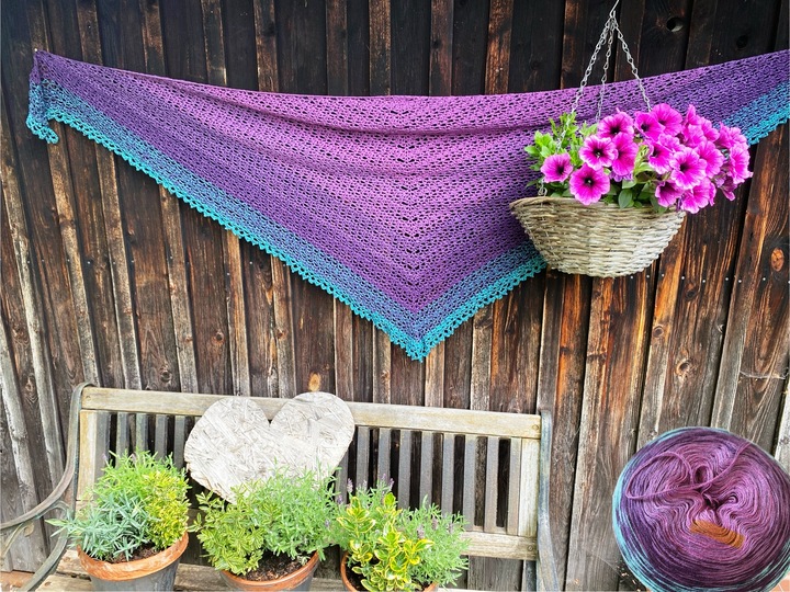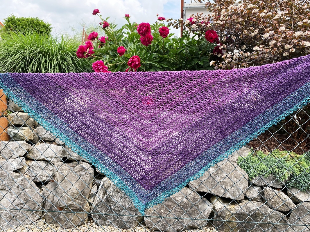 Das Tuch auf dem Titelbild wurde mit einem Bobbel Farbverlaufsgarn mit 1150 m, 3-fädig und Nadelstärke 3,75 angefertigt und misst ca. 214 x 84 cm.