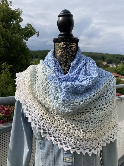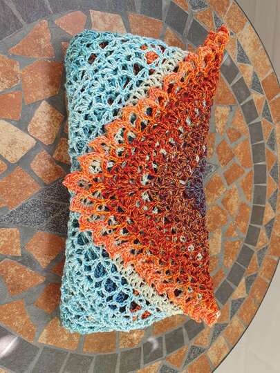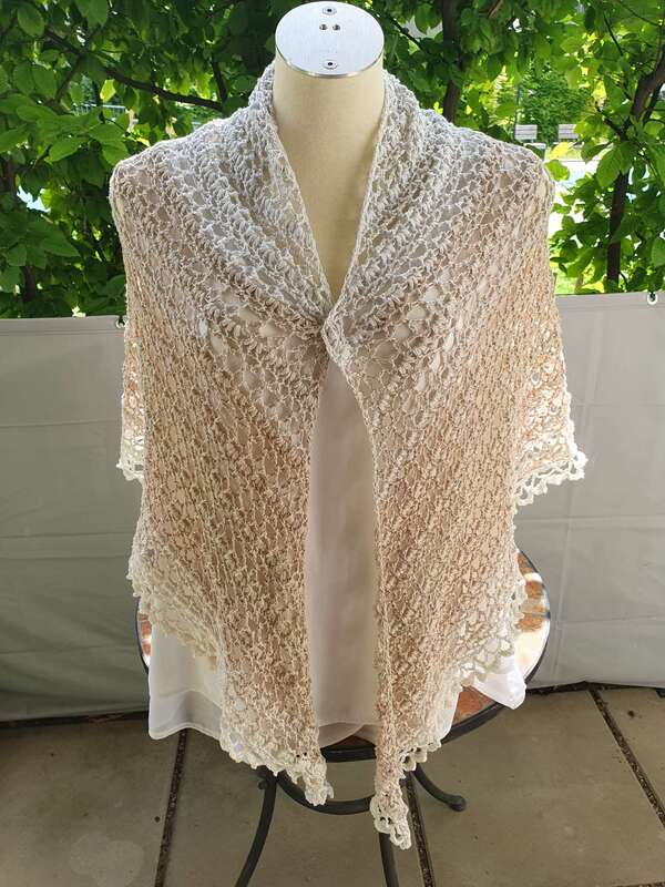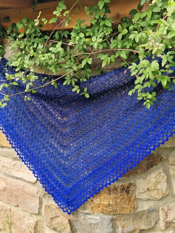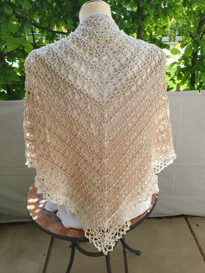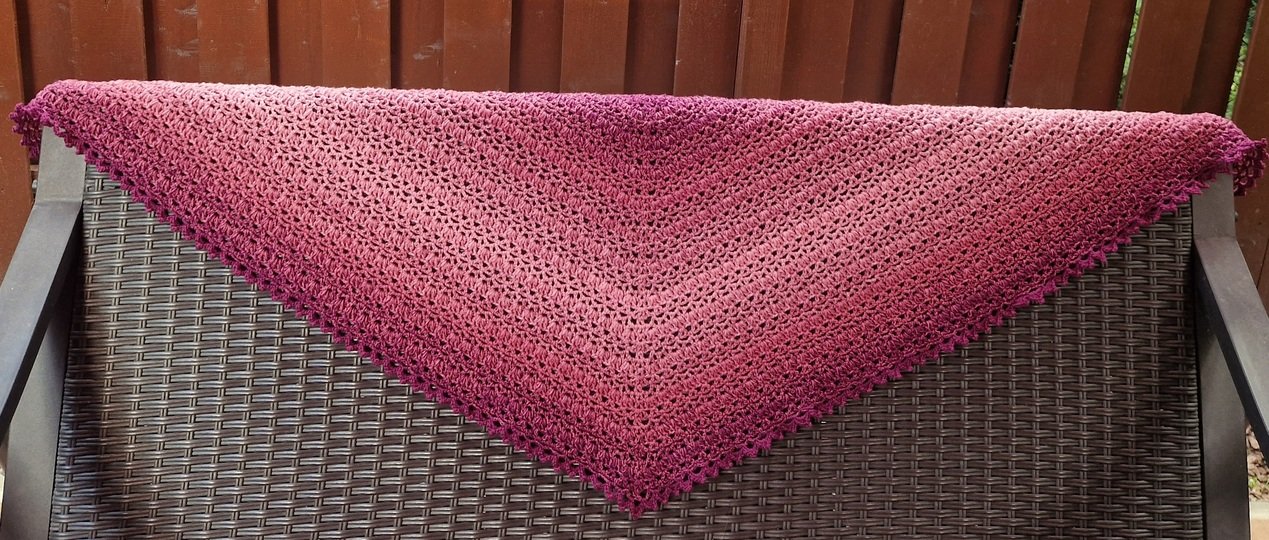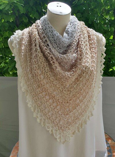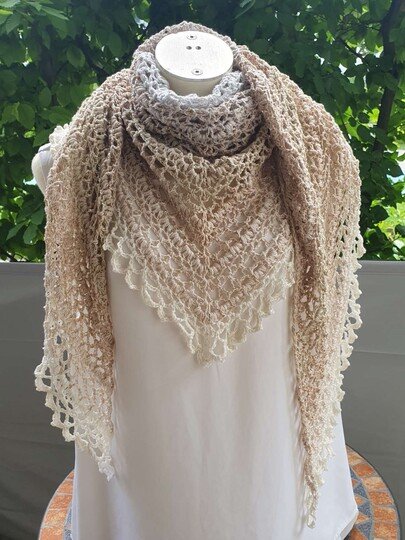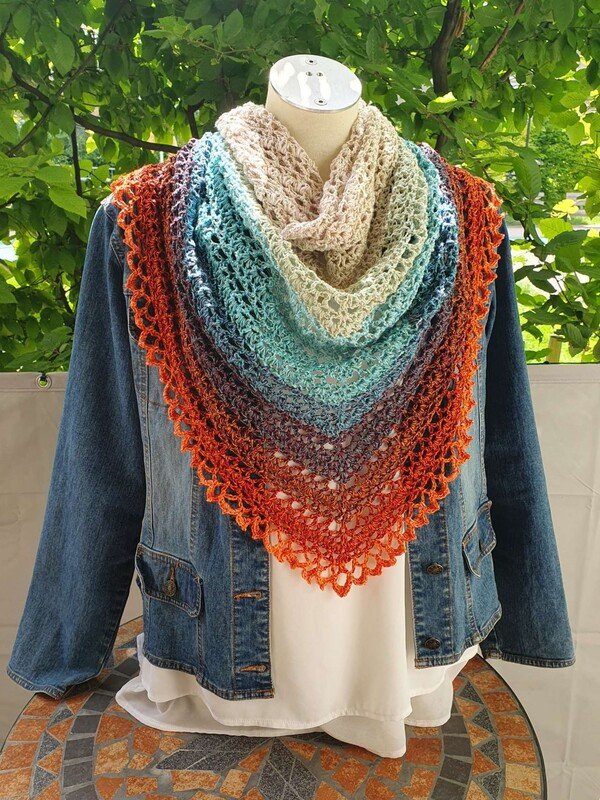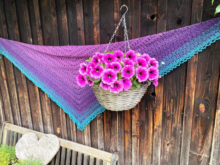 Das Tuch auf dem Titelbild wurde mit einem Bobbel Farbverlaufsgarn mit 1150 m, 3-fädig und Nadelstärke 3,75 angefertigt und misst ca. 214 x 84 cm.
